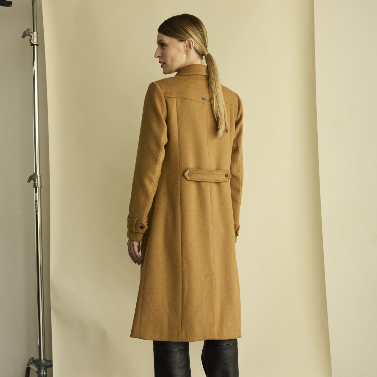 Tapado largo. Bolsillos con tapa (acceso superior). Presillas en manga con broches. Martingala con broches. Prenda forrada. Bordado interno.
