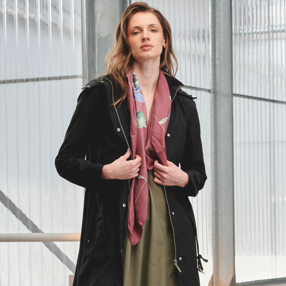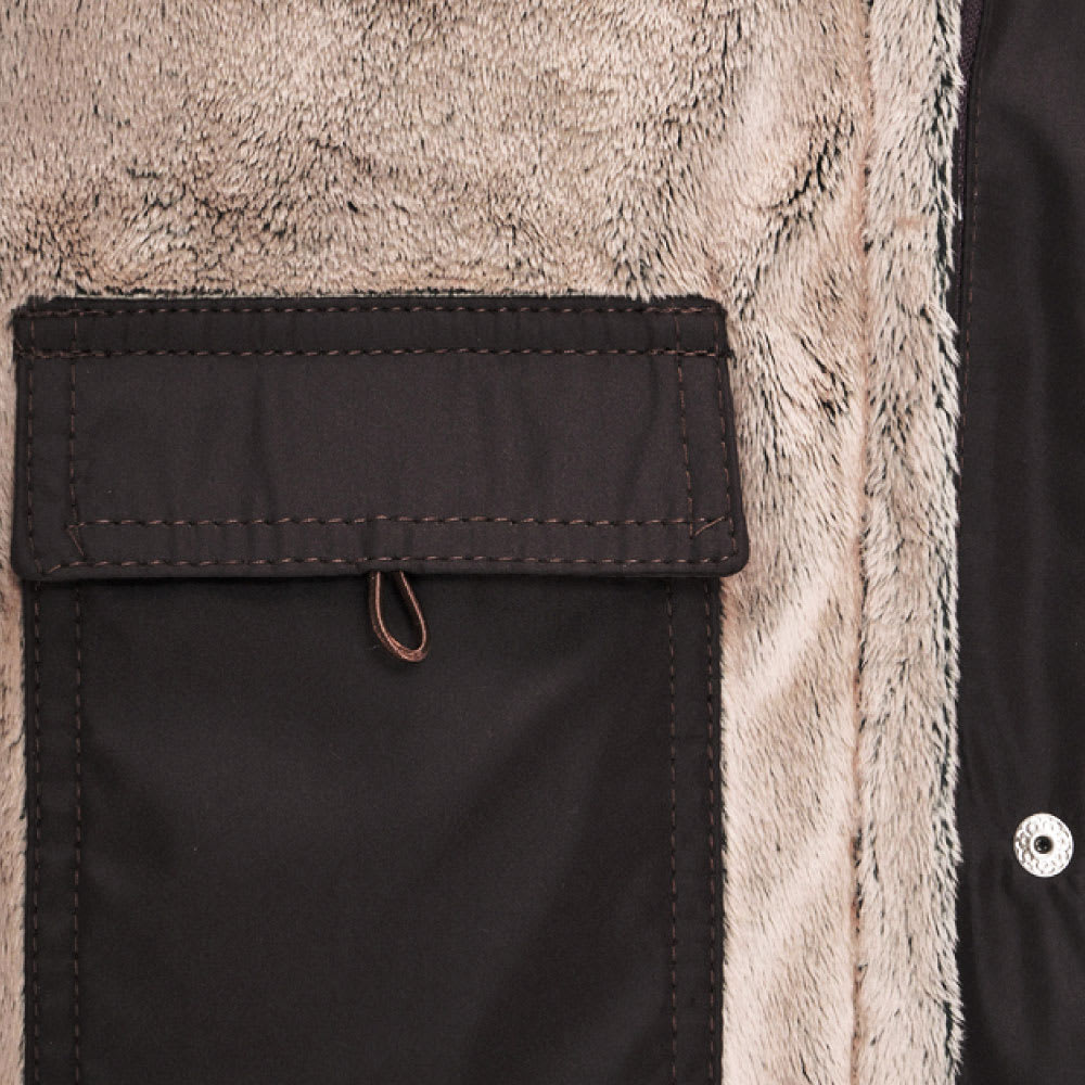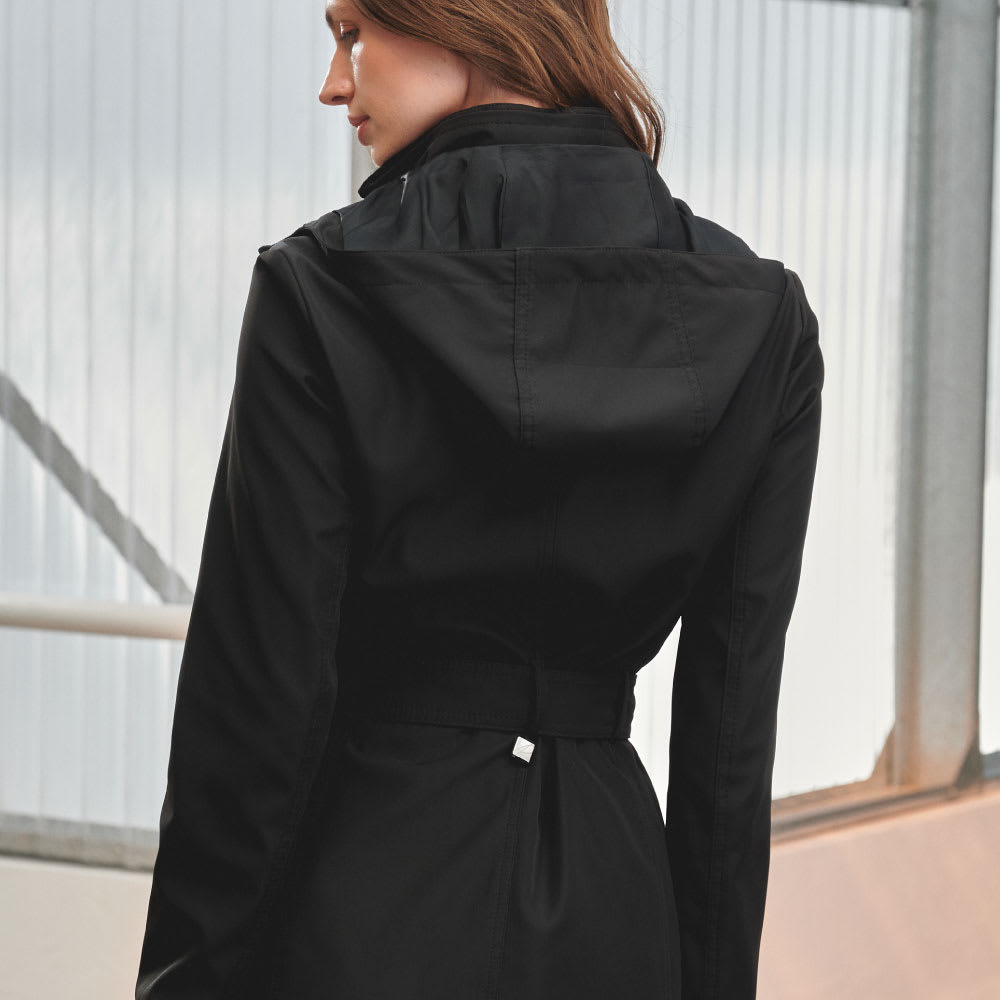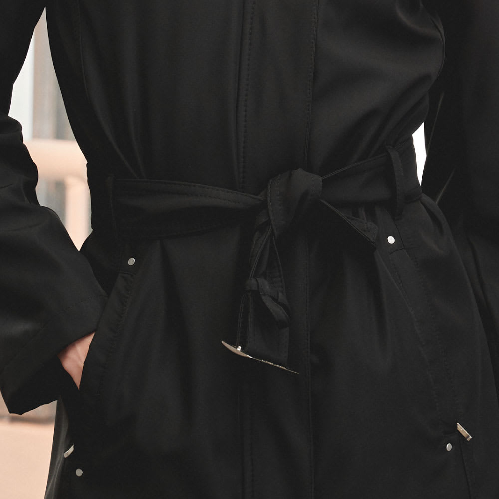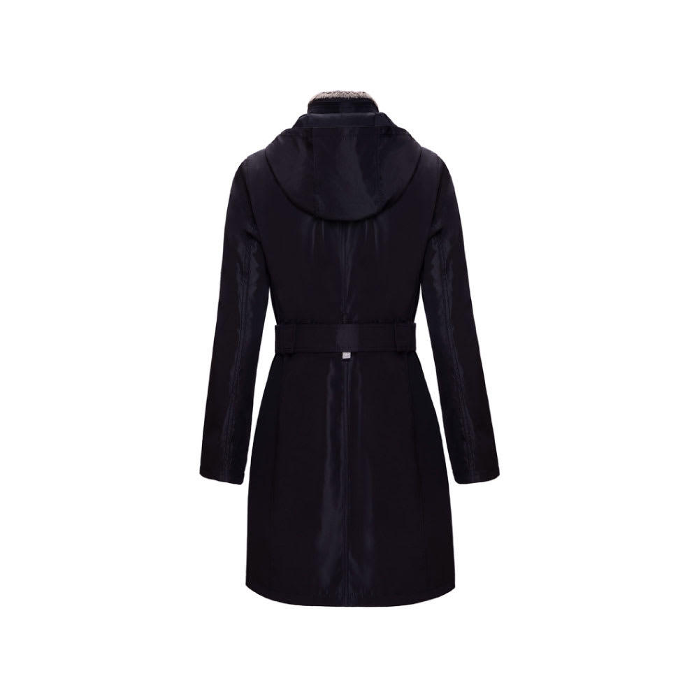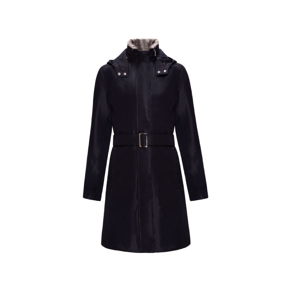 Abrigo impermeable. Capucha desmontable con broches. Lazo en cintura con hebilla. Apertura con bolsillo interior con broches y cierre oculto. Interior con abrigo de piel desmontable, con bolsillos.