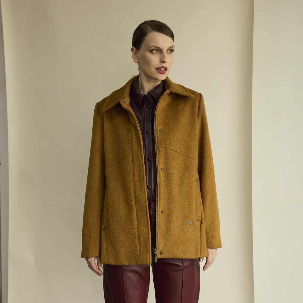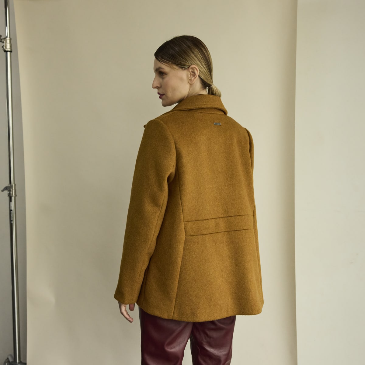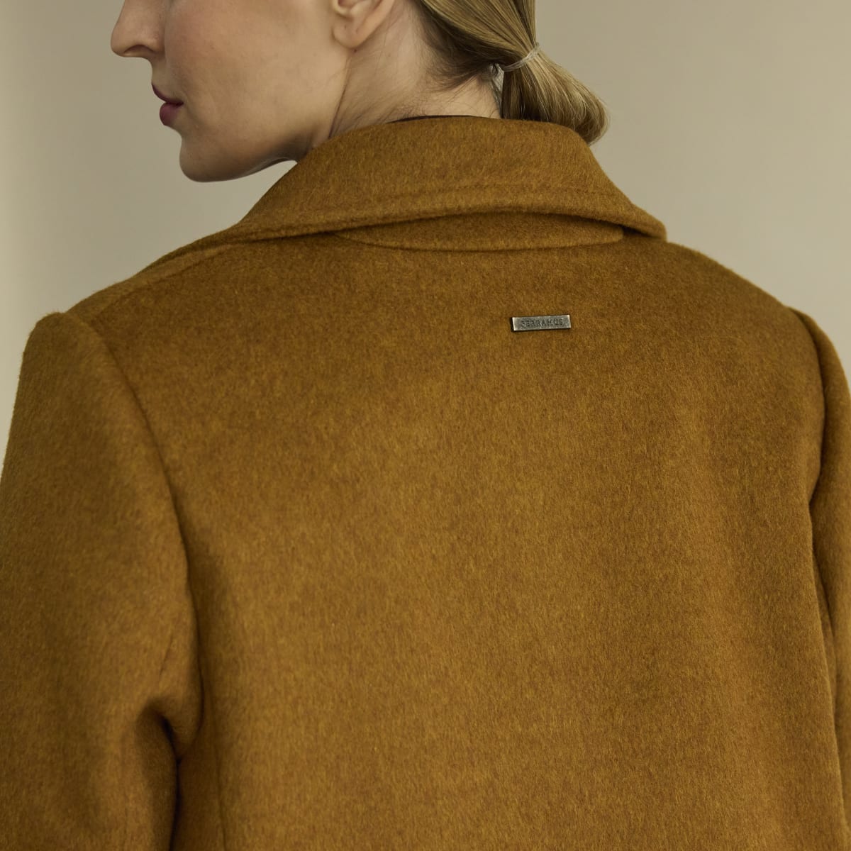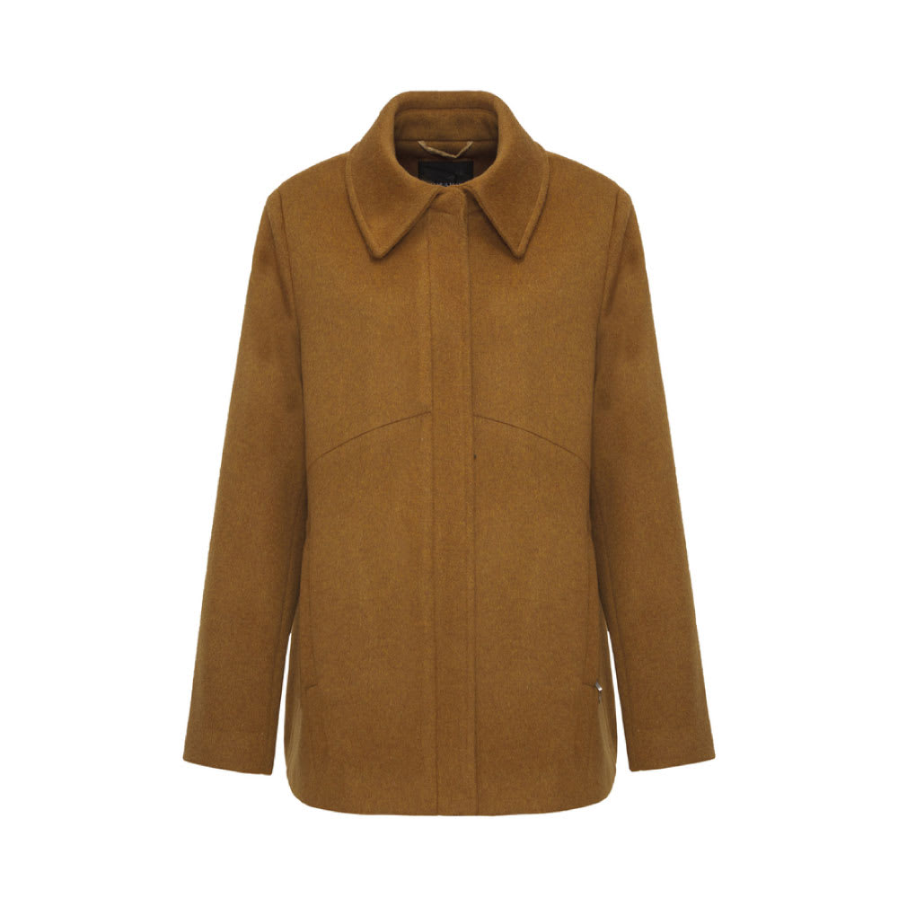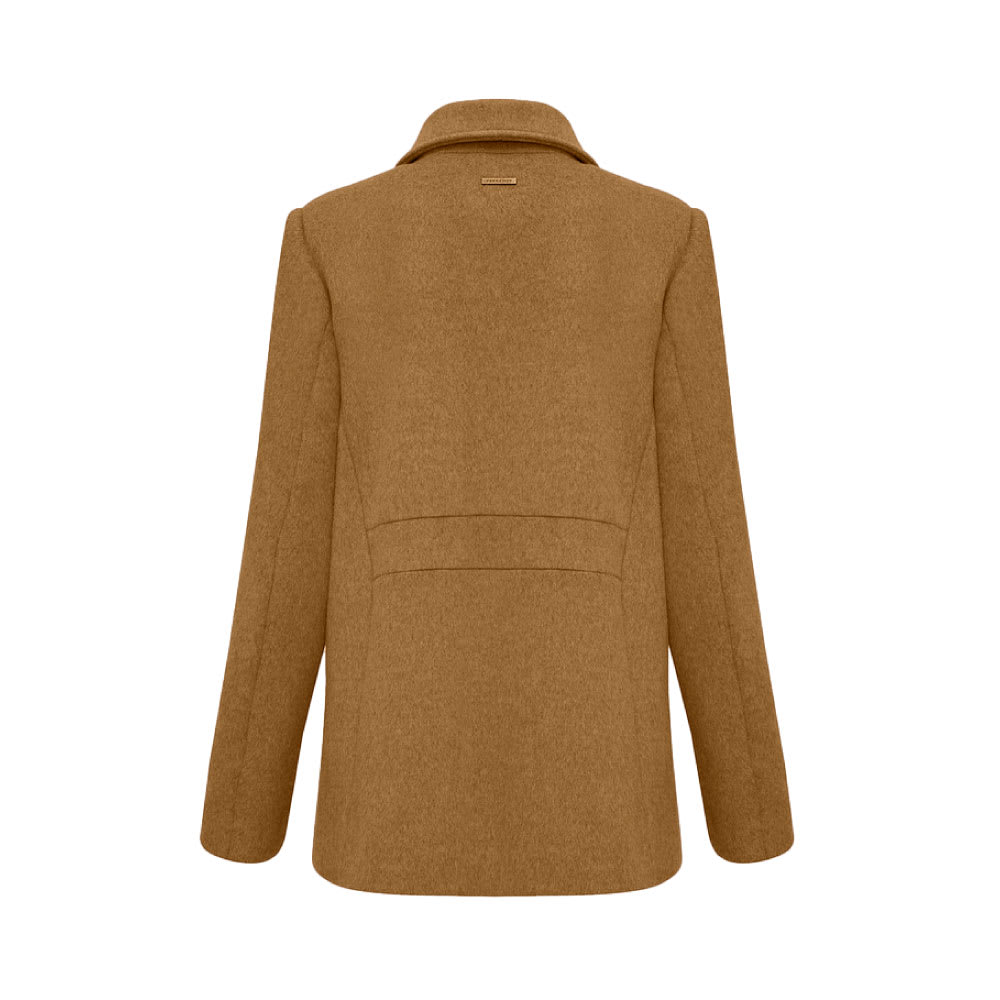 Abrigo corto con leve evase. Apertura por cierre y broches ocultos por solapa. Bolsillos en diagonal con cierre. Cuello camisero. Interior forrado. Bolsillos internos con cierre. Bordado interno personalizado.