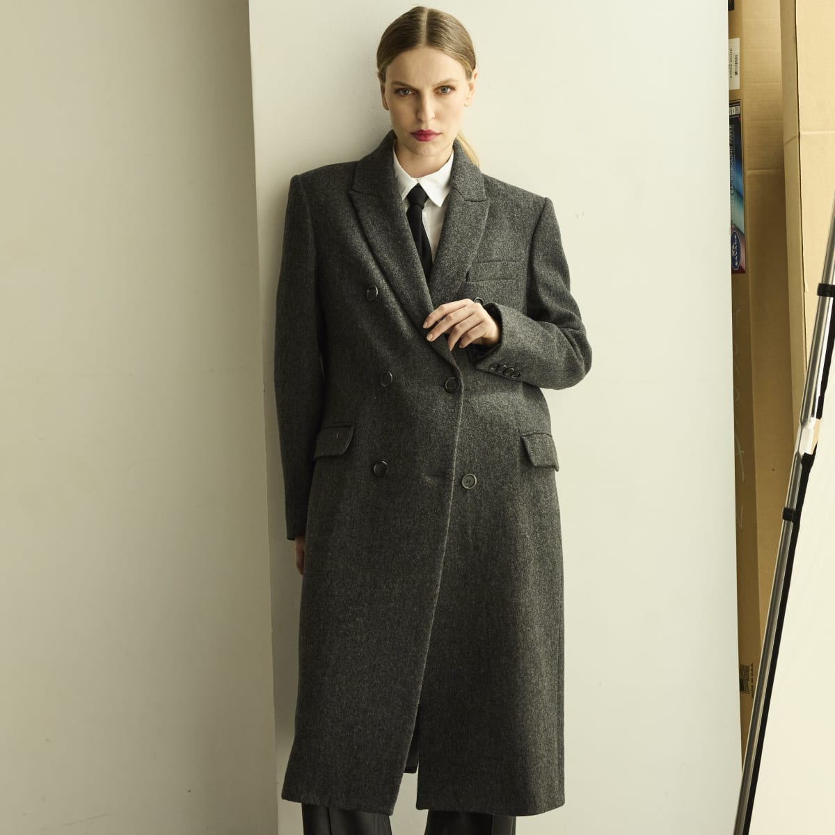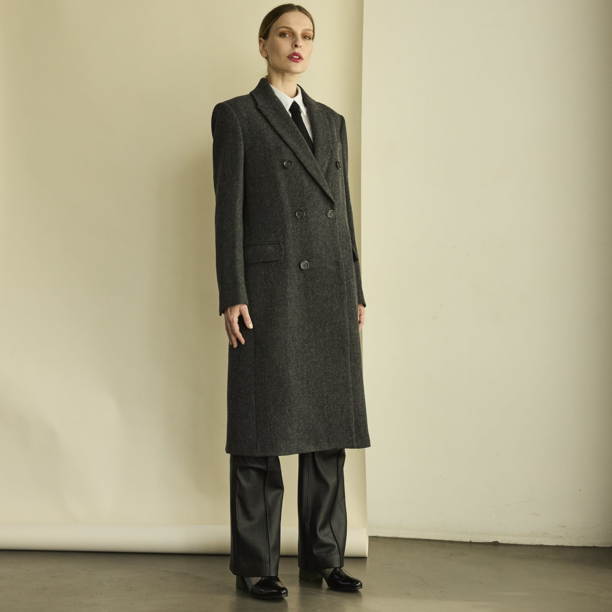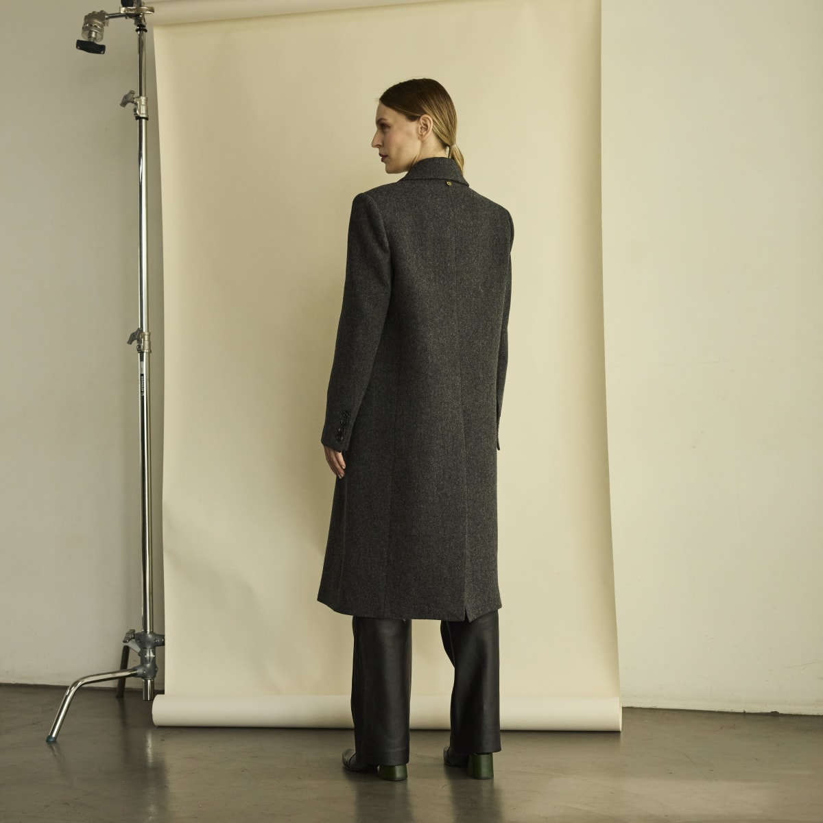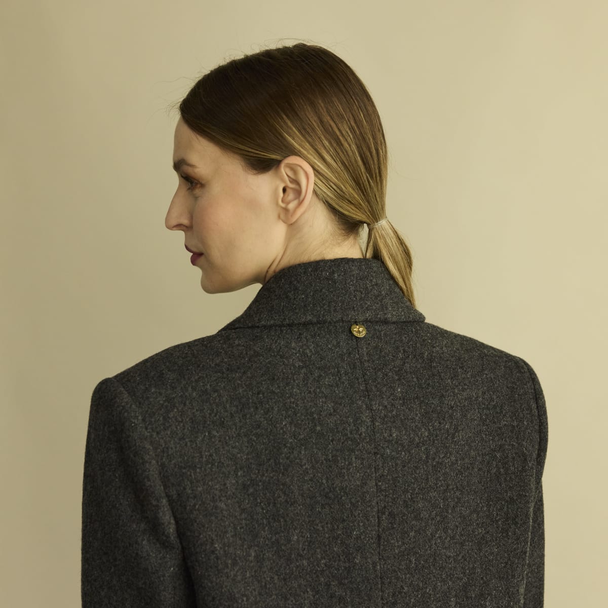 Abrigo confeccionado en paño de lana merino. De silueta clásica recta con hombreras. Botones jaspeados delanteros, bolsillo smoking en el frente y bolsillos con solapa. Interior íntegramente forrado con Tafeta Jacquard.