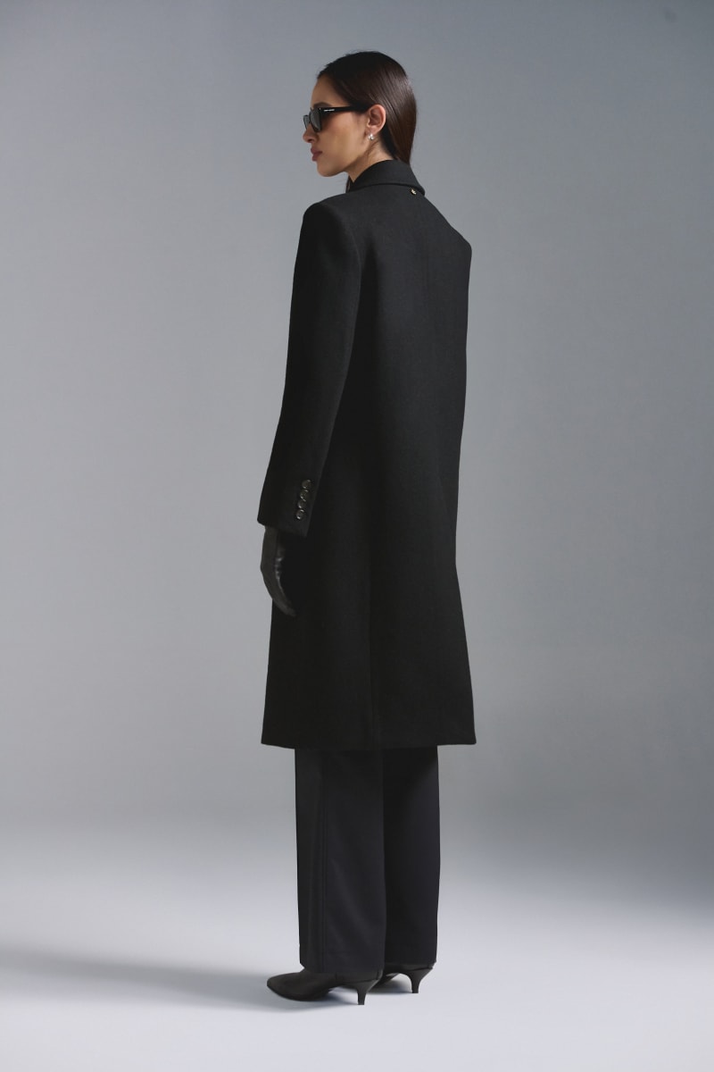 Abrigo confeccionado en paño de lana merino. De silueta clásica recta con hombreras. Botones jaspeados delanteros, bolsillo smoking en el frente y bolsillos con solapa. Interior íntegramente forrado con Tafeta Jacquard.