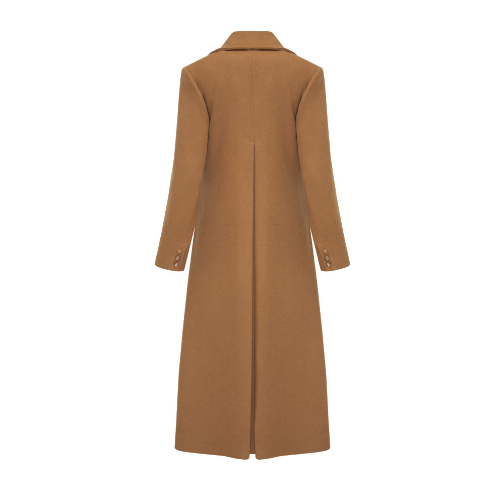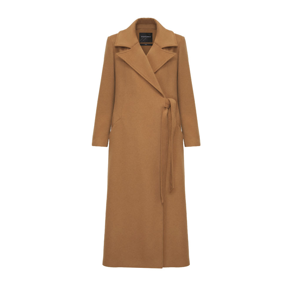 Abrigo largo. Cruzado con botones y lazo a un lado. Cuello tipo solapa. Bolsillos en diagonal sobre linea de recorte. Tablon en espalda. Botones en manga.