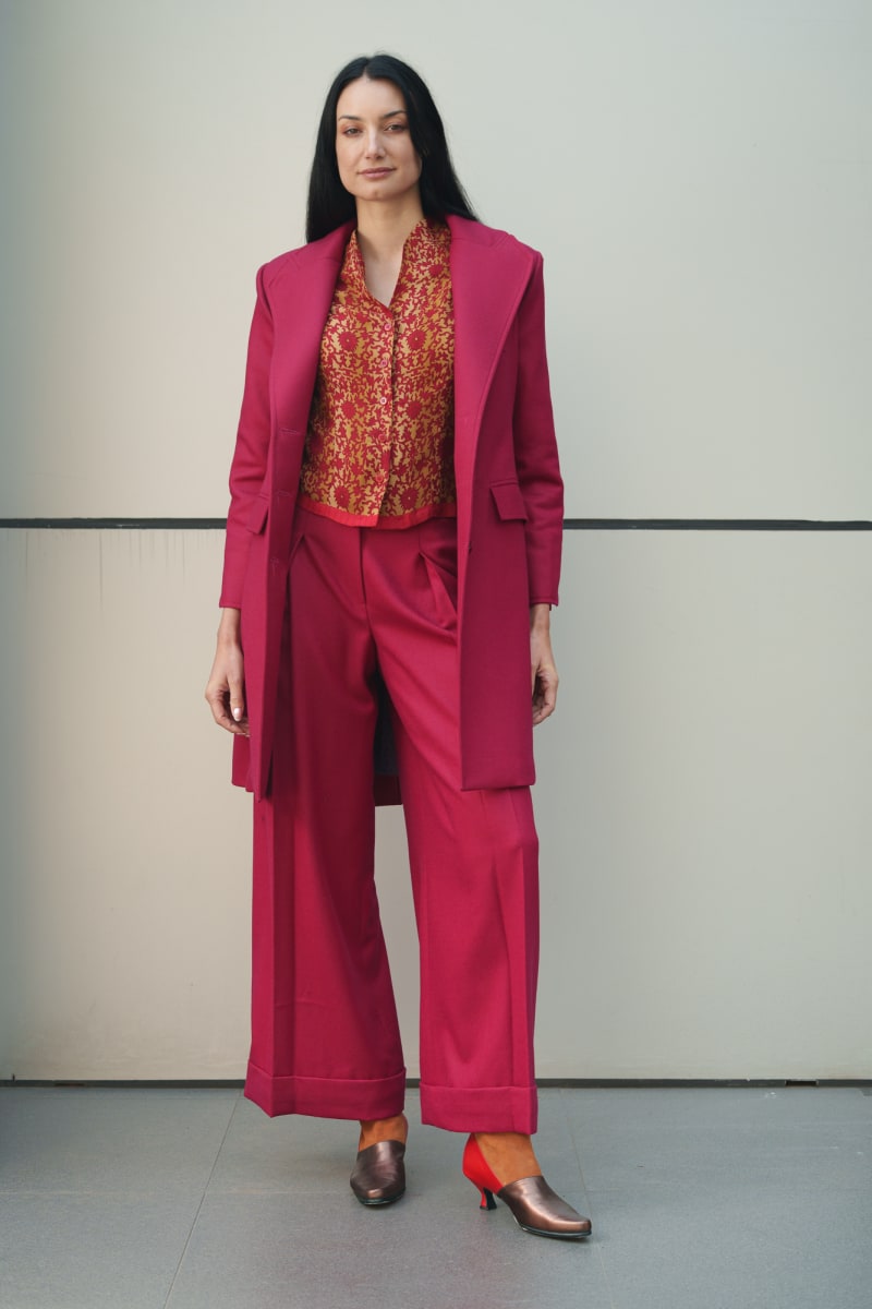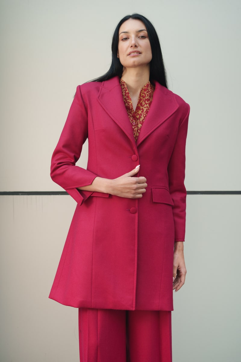 Confeccionado en telas de fabricación chilena: franela ligera 100% lana de Bellavista Tomé, reforzada en algodón y forrada en rayón/viscosa de Strobel Linnings.