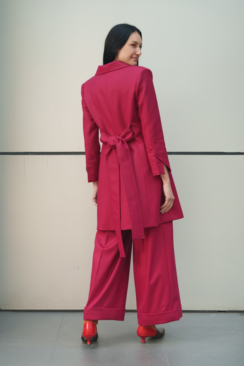 Tiene cuidados detalles estructurales: solapa y puños desplazados, cruce simple con botones forrados, bolsillo de tapeta inclinado y un lazo para marcar el entalle.