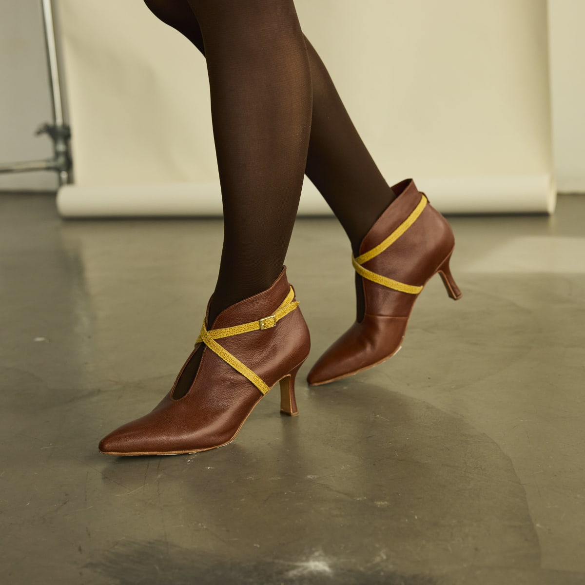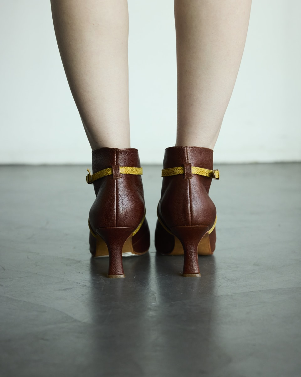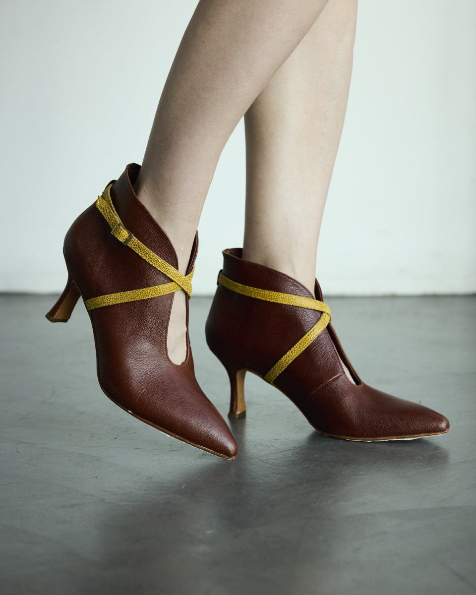 Confeccionada a mano en Argentina, combina cuero vacuno marrón con textura natural y cuero de cabra fantasía, ofreciendo un contraste sutil y elegante. El diseño destaca por su abertura frontal en forma de gota, que estiliza el empeine y agrega un toque distintivo.