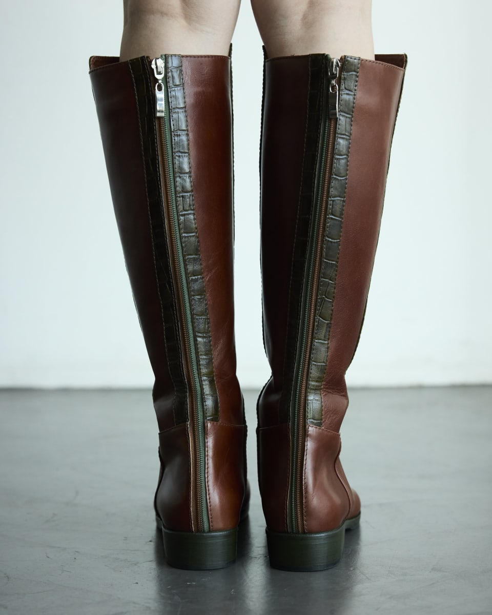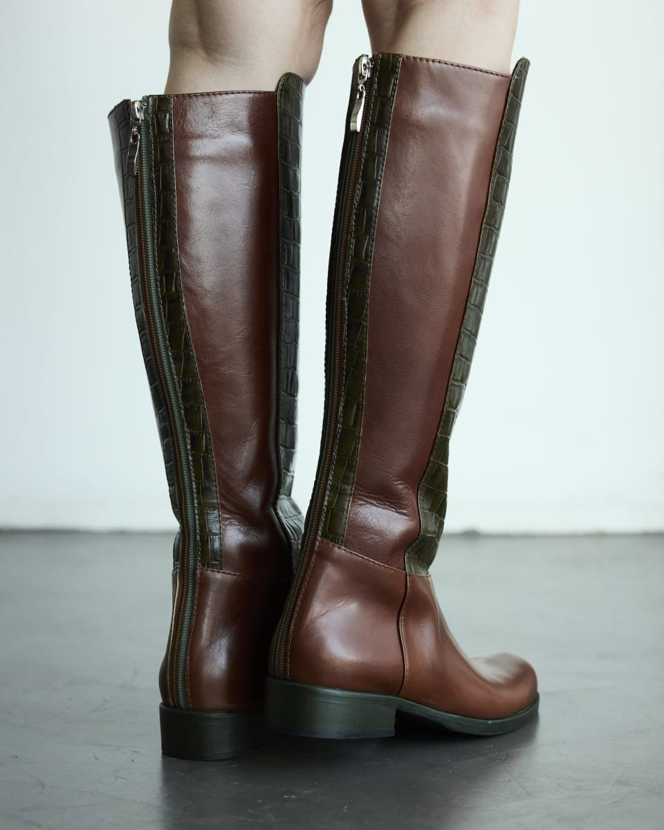 Confeccionada en cuero vacuno combinado, destaca por su frente en cuero con textura croco, que añade un toque audaz y estructurado. Su forro interior en cuero natural asegura una experiencia de uso suave y cómoda, mientras que el taco de 2 cm entrega la altura justa para el uso diario.