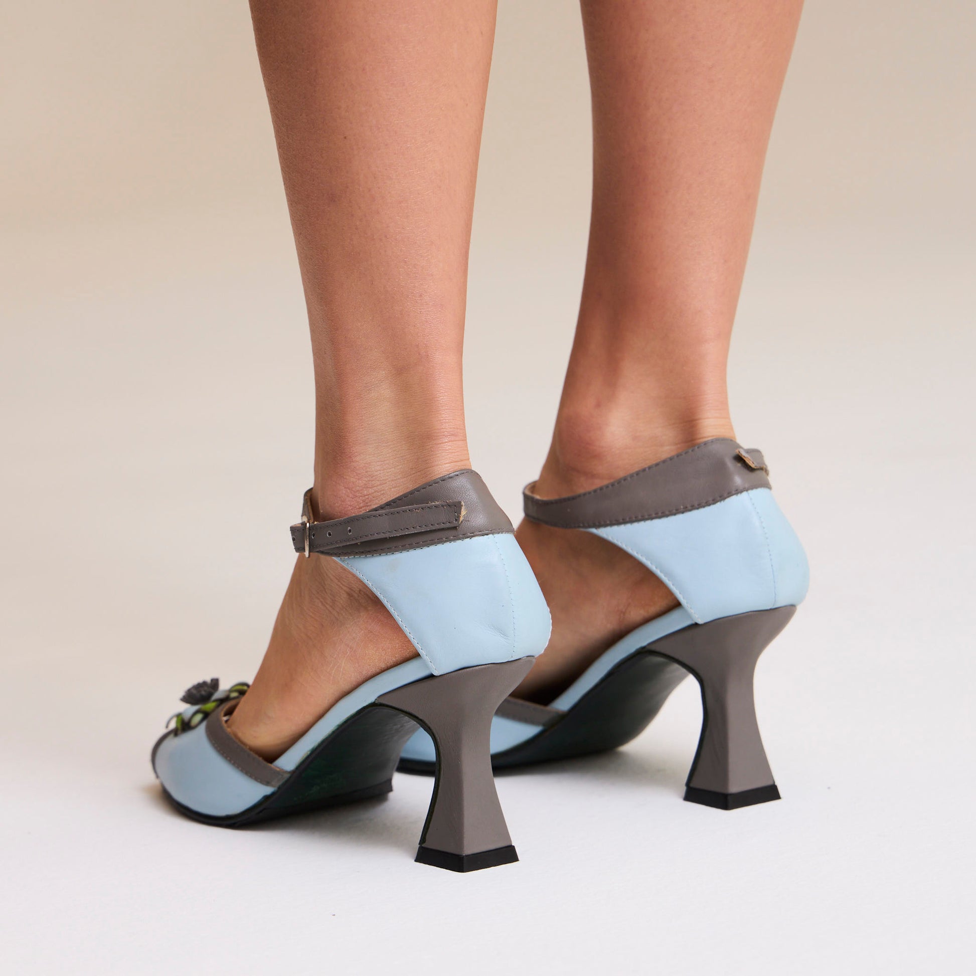Hecho a mano con cuero vacuno combinado, forrado completamente en cuero natural y con suela también en cuero, ofrece una sensación de suavidad y firmeza en cada paso. El taco de 5,5 cm estiliza la figura sin comprometer la estabilidad.