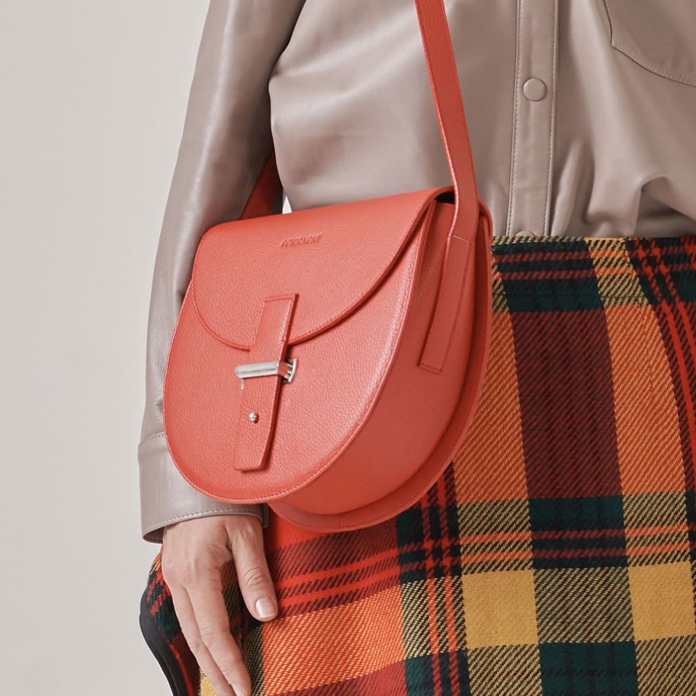 Cartera con pasador frontal y correa regulable. De estructura rígida y resistente. Cuenta con 1 bolsillo interior y portallaves. Realizado 100% en cuero vacuno.