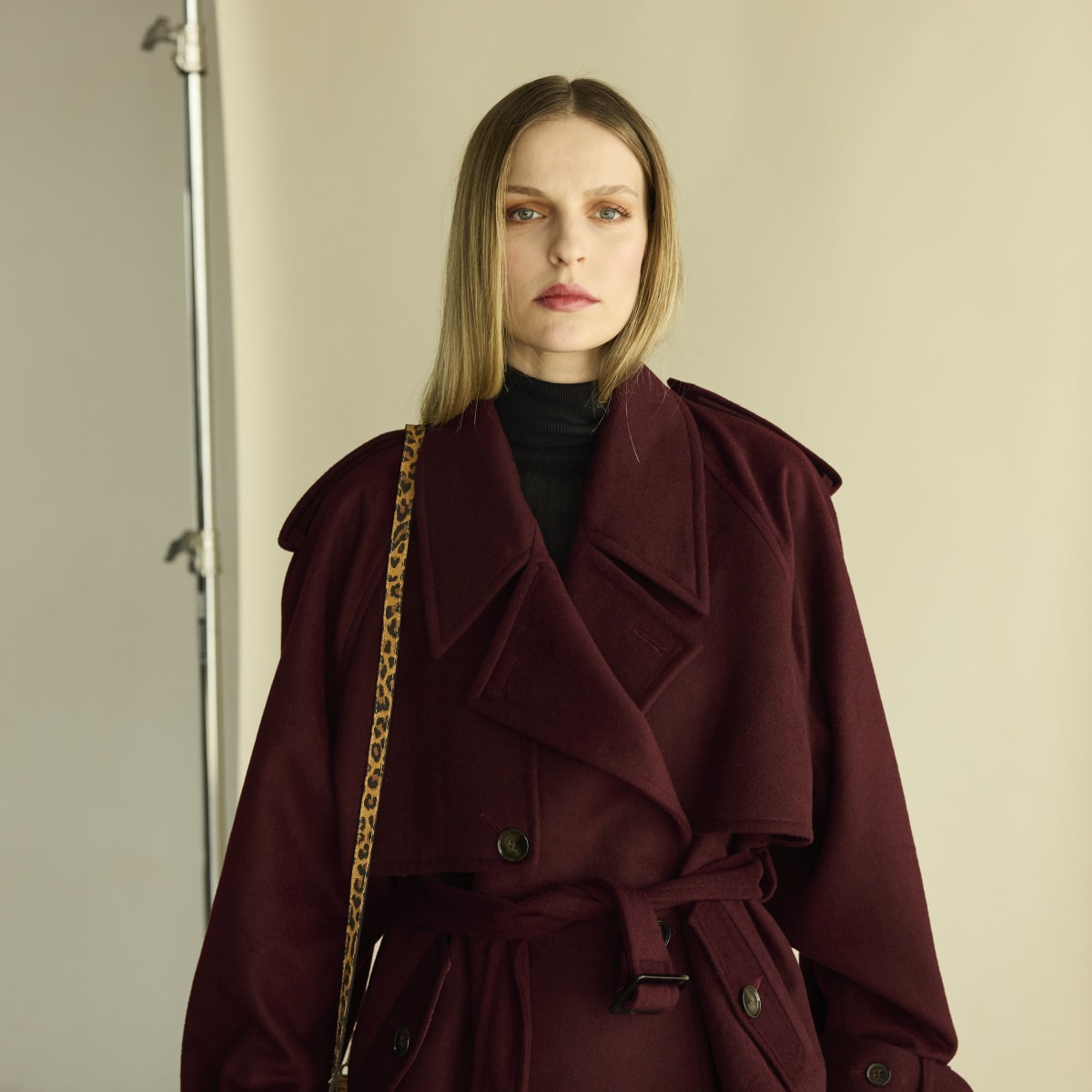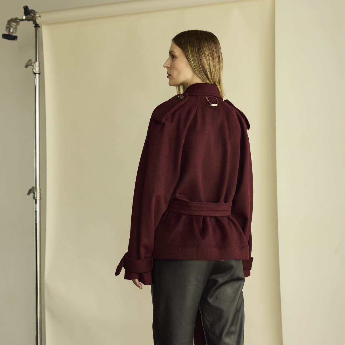 Chaquetón tipo trench corto. Oversize, confeccionado en paño sastre. Presillas en puño desmontables y ajustables. Charreteras en hombro y lazo del mismo paño desmontable. Botones al frente jaspeados y hebillas a tono.