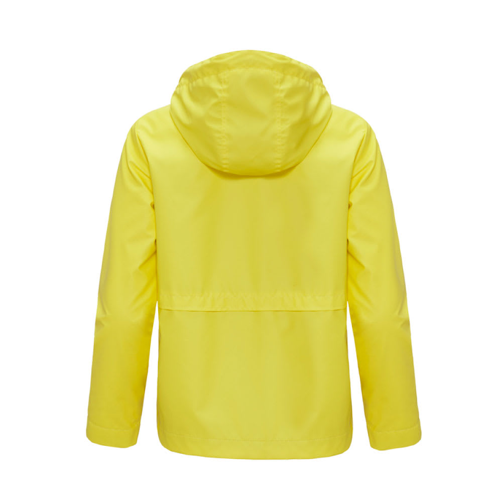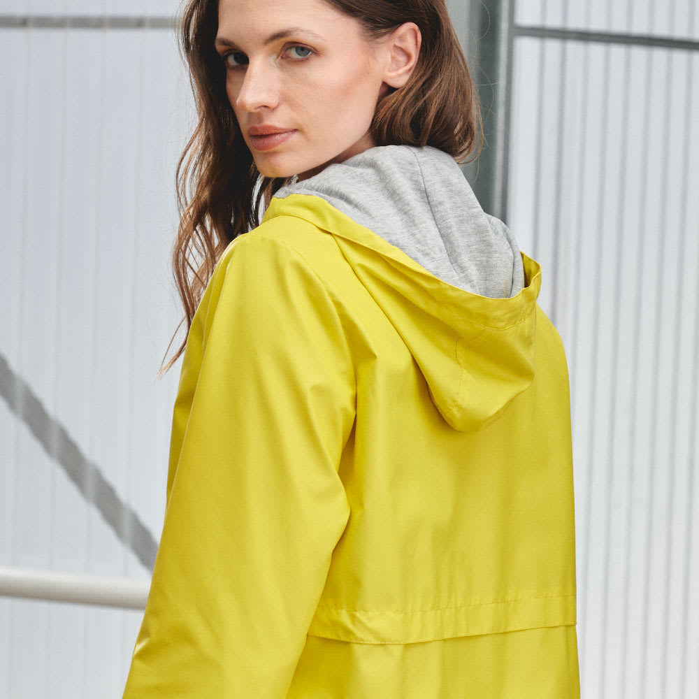 Cortaviento impermeable corto de mujer estilo naútico. Apertura por cierre a la vista. Posee bolsillos con cierre invisible en sentido vertical en la parte superior de la prenda. Posee bolsillos con cierre en sentido diagonal en la parte inferior de la prenda. Abertura en laterales. Puños internos de manga. Capucha desmontable, forrada. Interior forrado en jersey. Mangas forradas en nylon. Bolsillos internos con cierre. Estampa personalizada en el interior.