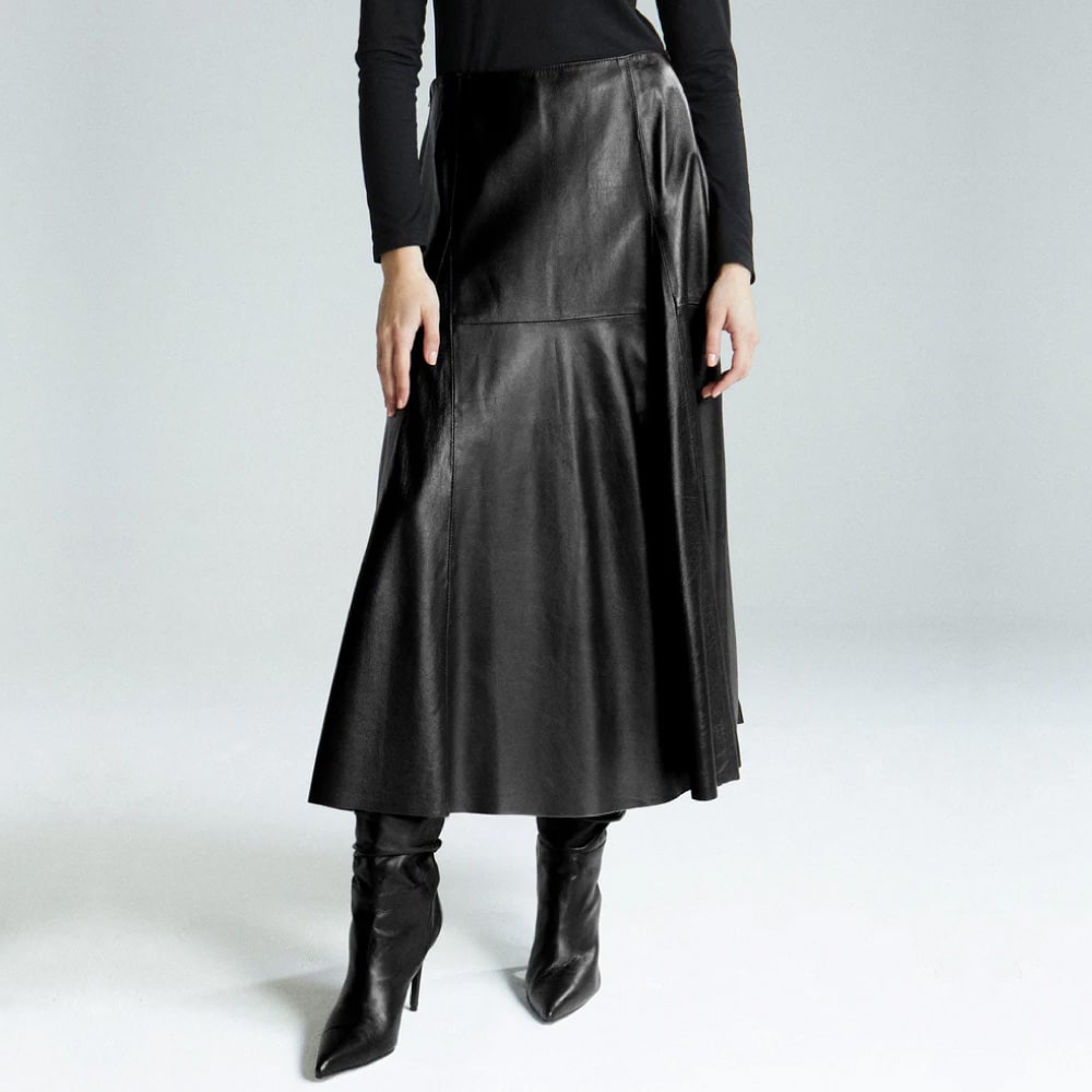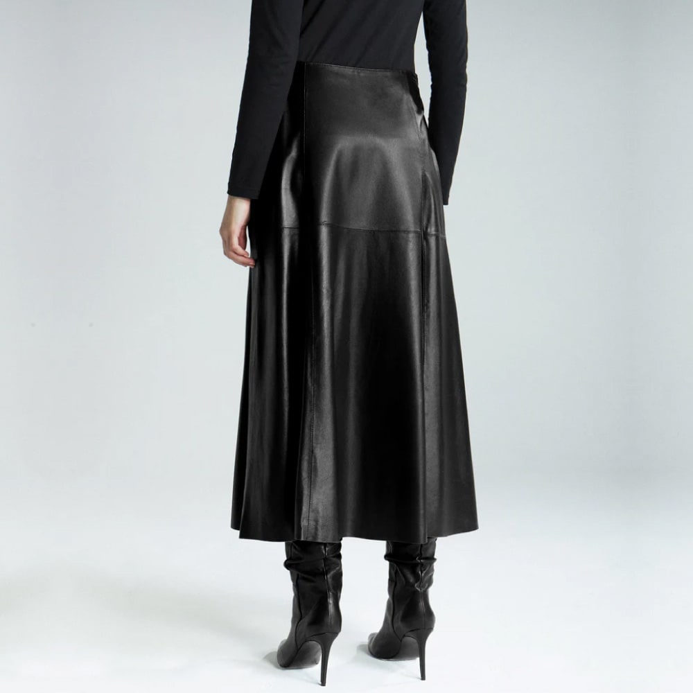 Falda Elisa con cintura ajustada y cierre al costado. Falda evasé larga con paneles.