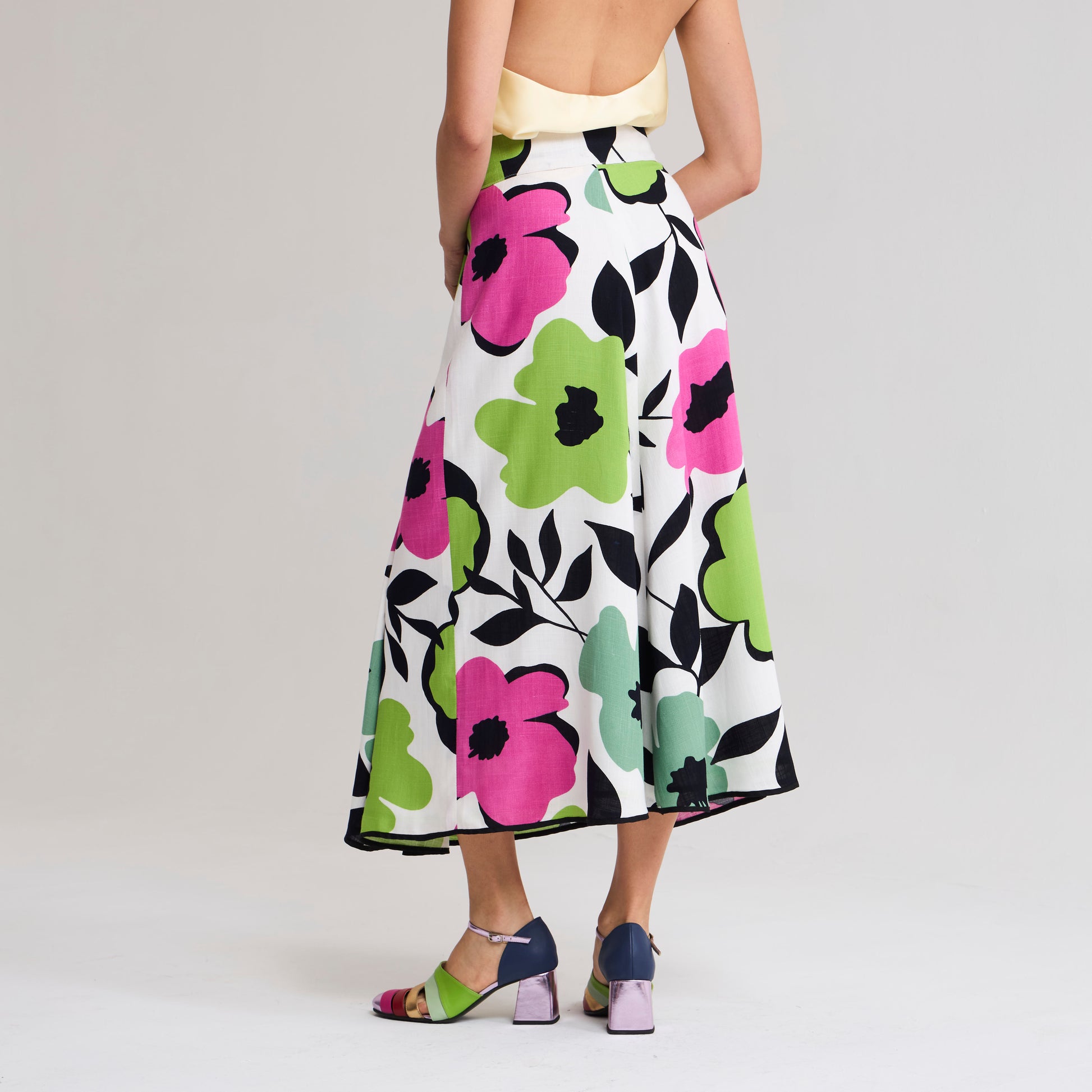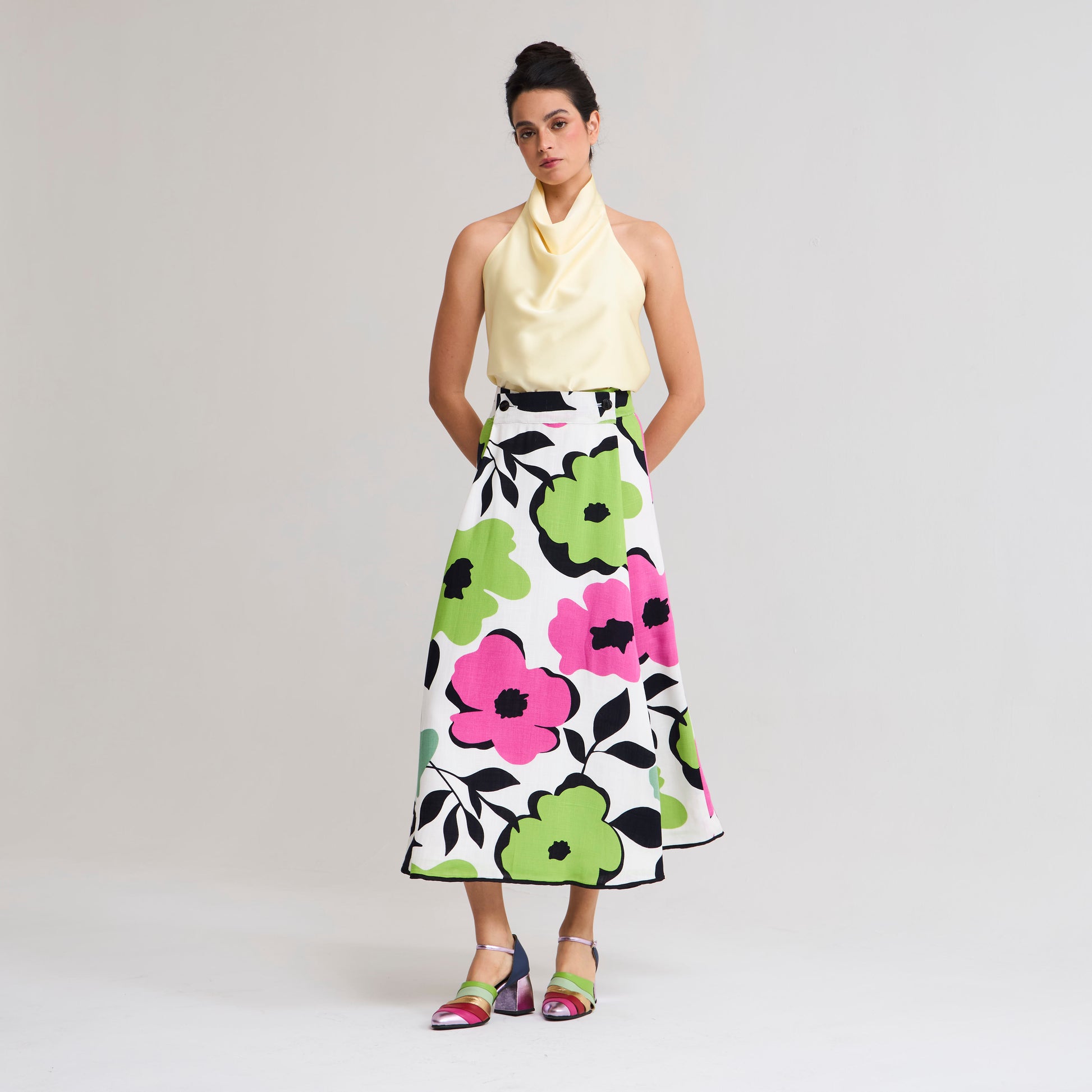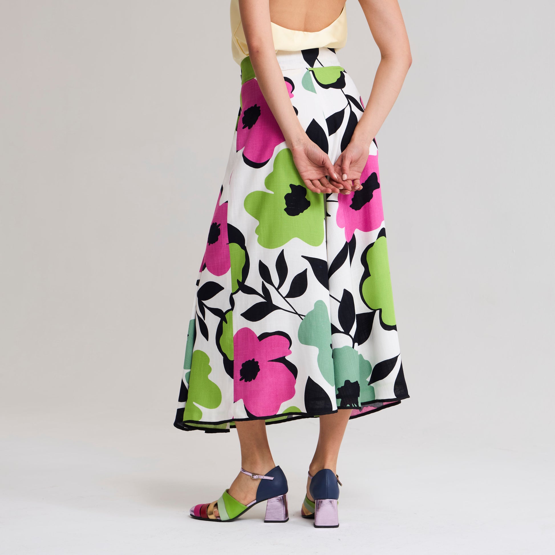 Diseño Multitalla. La posibilidad de ajustarlo a tu medida y el movimiento del ruedo lo hacen cómodo y ultra femenino. Pretina ajustable con botones y bordes con vivos en contraste, corte evasée con tablones profundos en delantero. Capa exterior en lino/algodón brasilero y forro rayón fabricado en Chile.