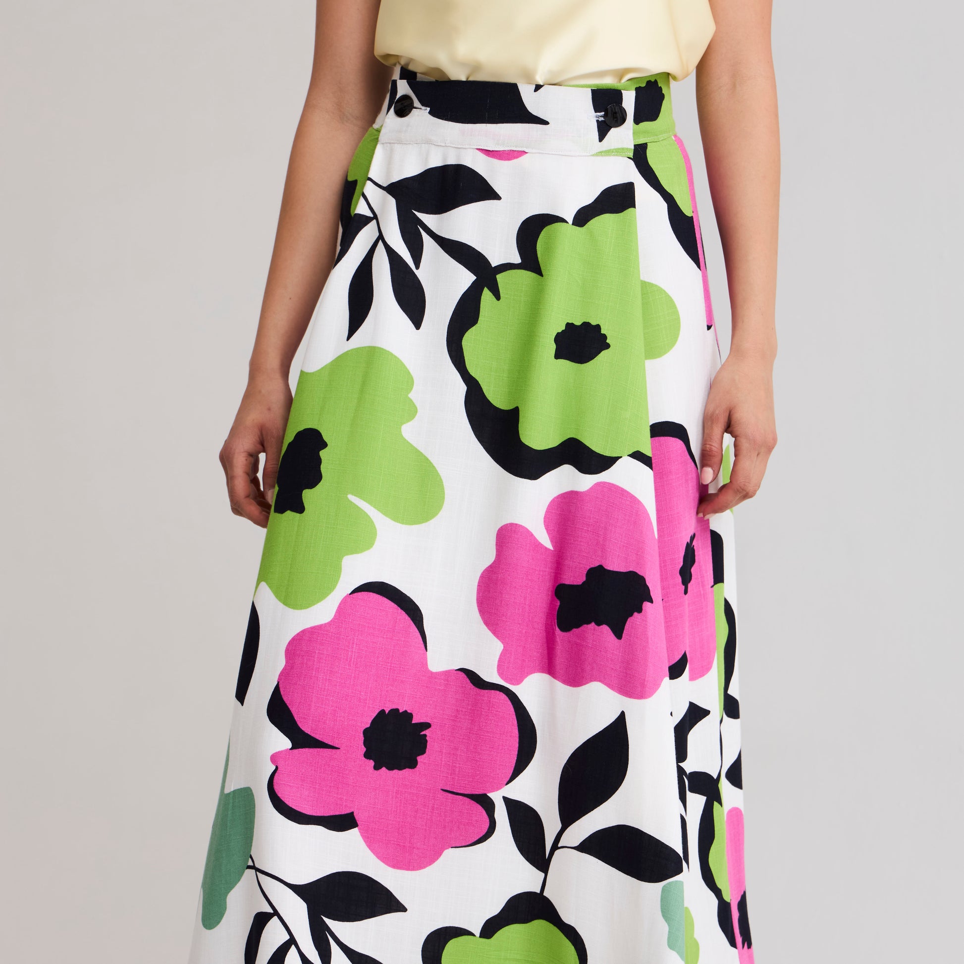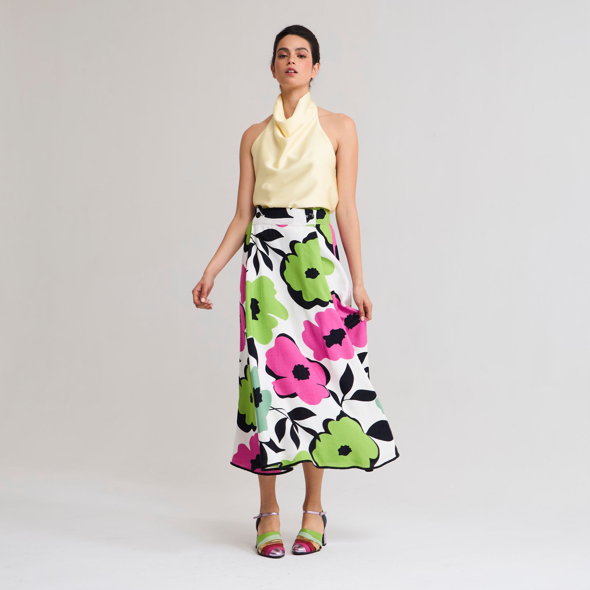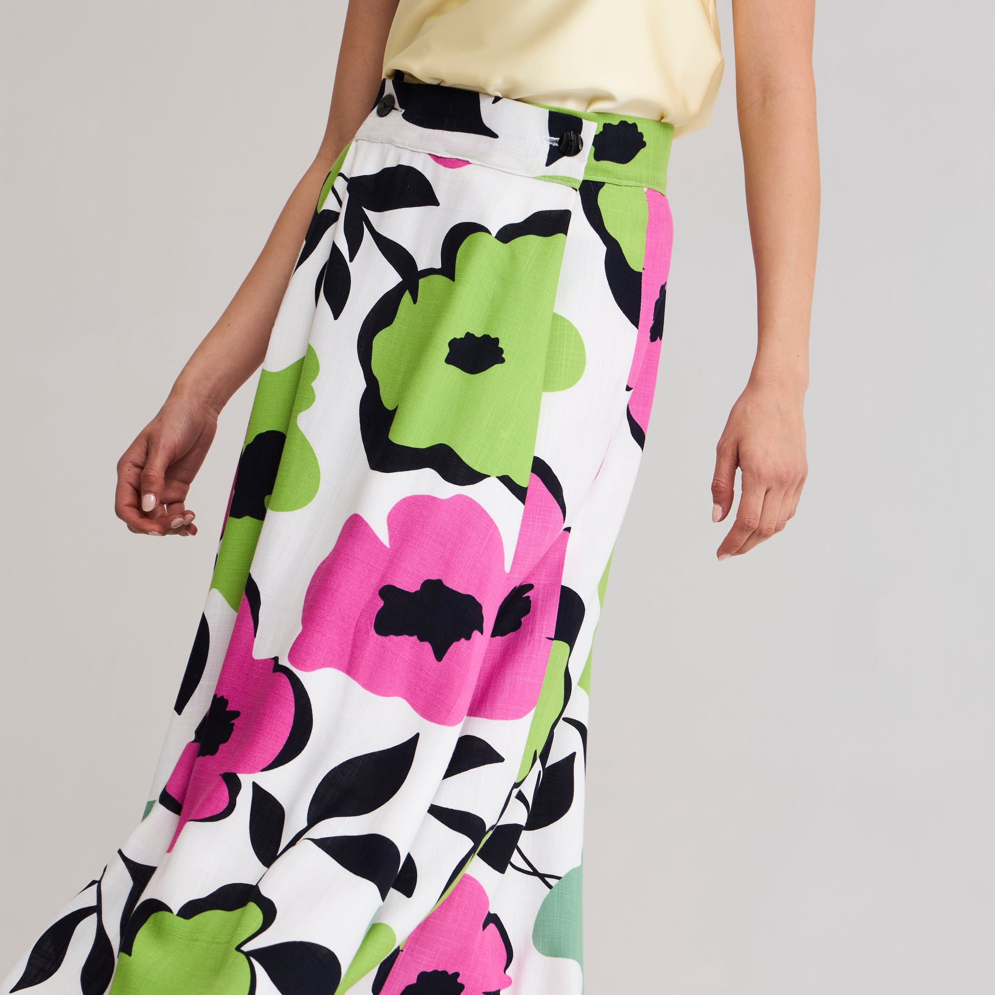 Diseño Multitalla. La posibilidad de ajustarlo a tu medida y el movimiento del ruedo lo hacen cómodo y ultra femenino. Pretina ajustable con botones y bordes con vivos en contraste, corte evasée con tablones profundos en delantero. Capa exterior en lino/algodón brasilero y forro rayón fabricado en Chile.