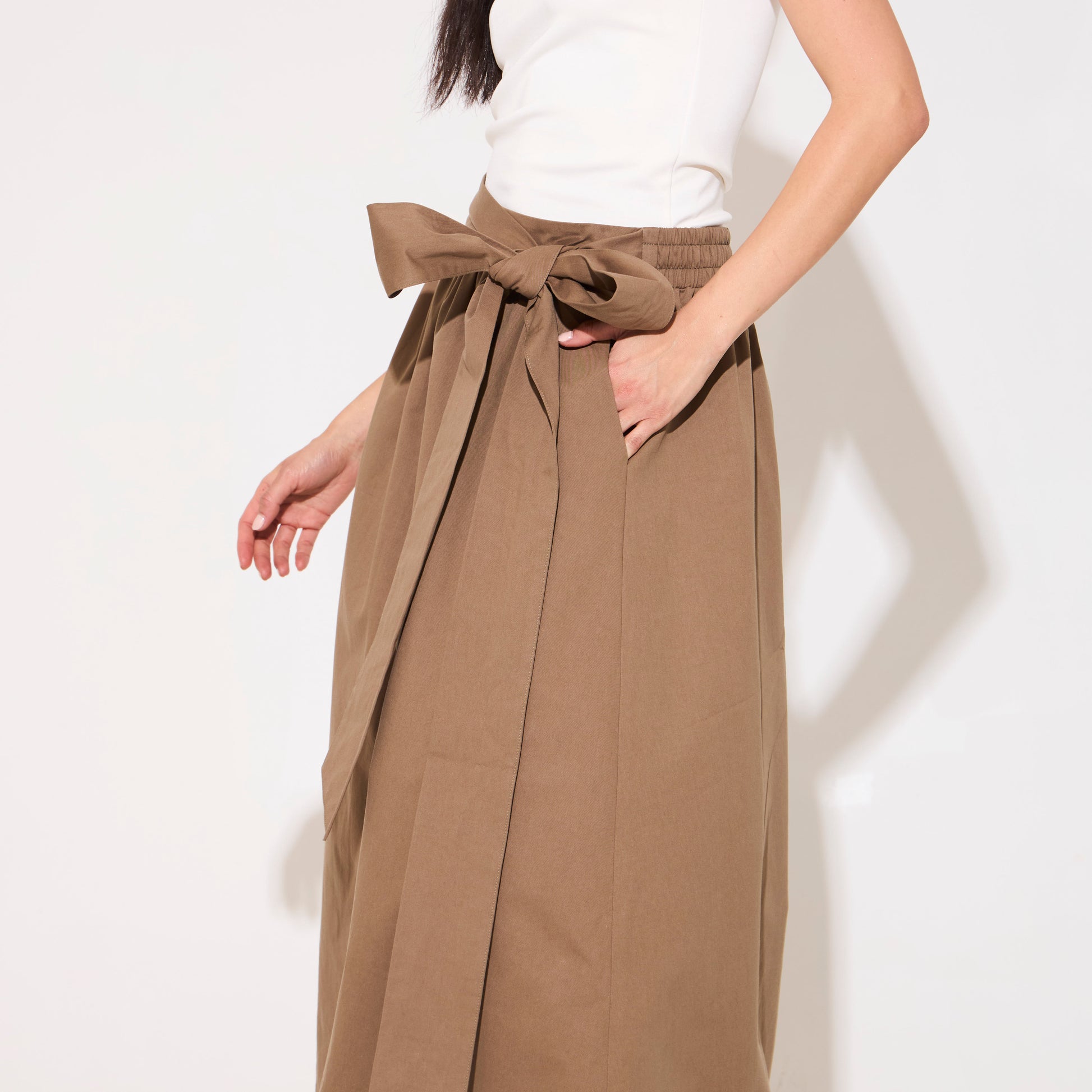 Falda de gabardina. De silueta en evasé y largo midi con elástico en la cintura trasera y lazo incorporado del mismo textil. Posee bolsillos laterales reales y se encuentra íntegramente forrado con tafeta apaisada. Disponible también en color Sand.