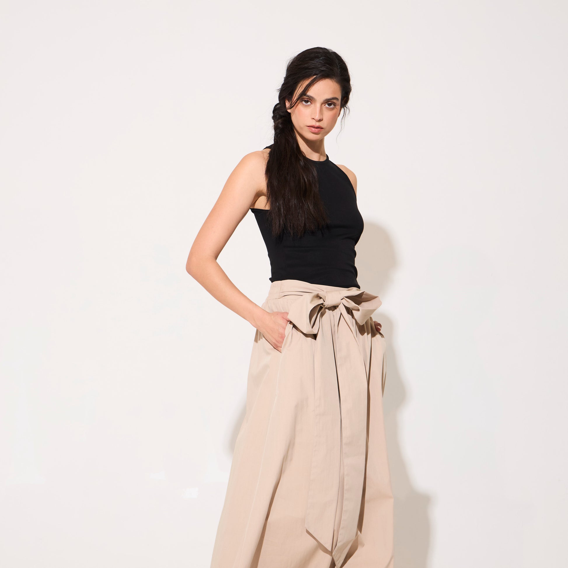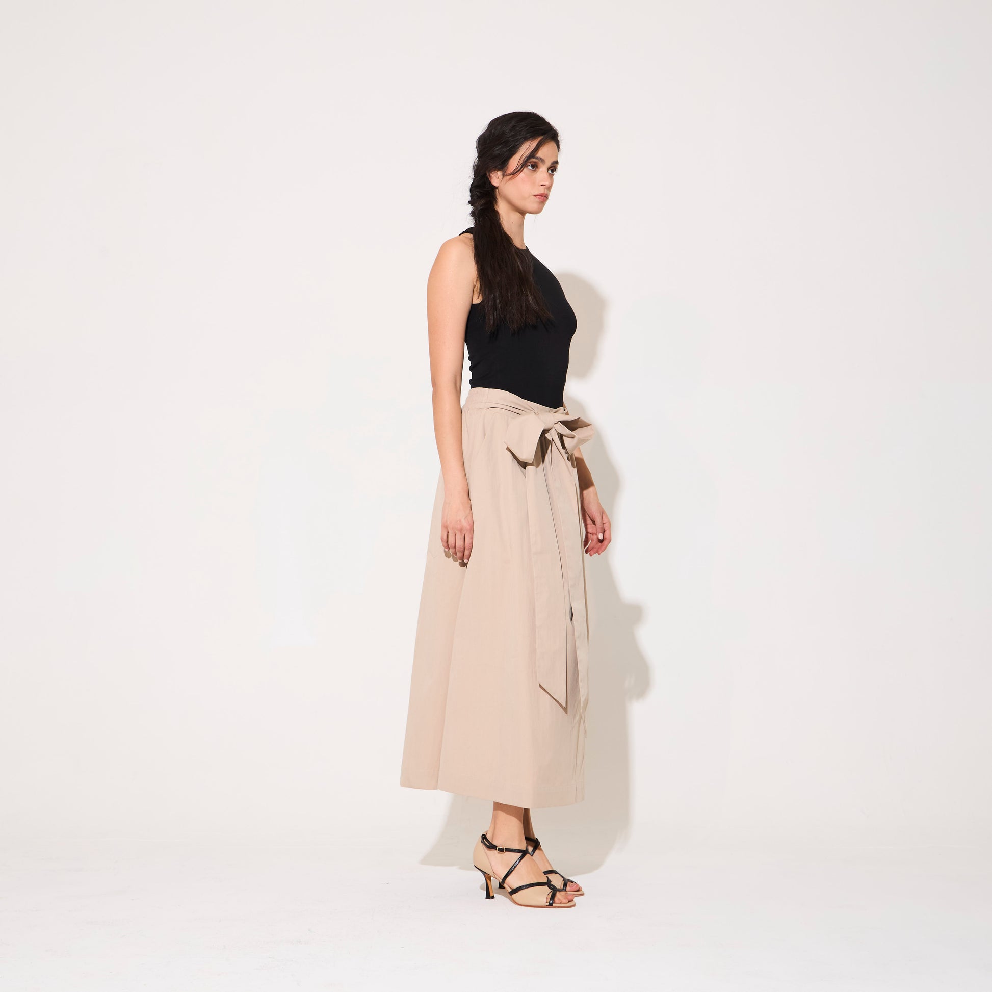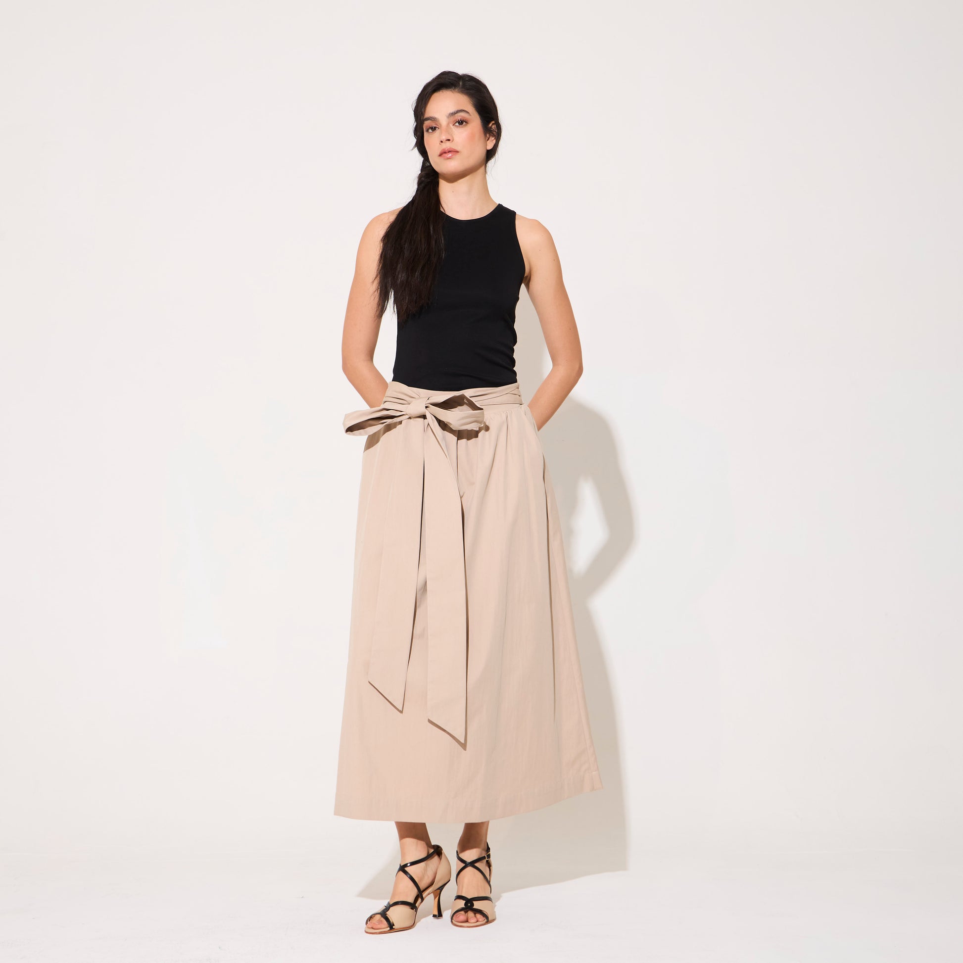 Falda de gabardina. De silueta en evasé y largo midi con elástico en la cintura trasera y lazo incorporado del mismo textil. Posee bolsillos laterales reales y se encuentra íntegramente forrado con tafeta apaisada. Disponible también en color Kaki.