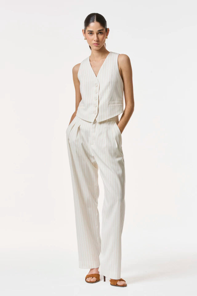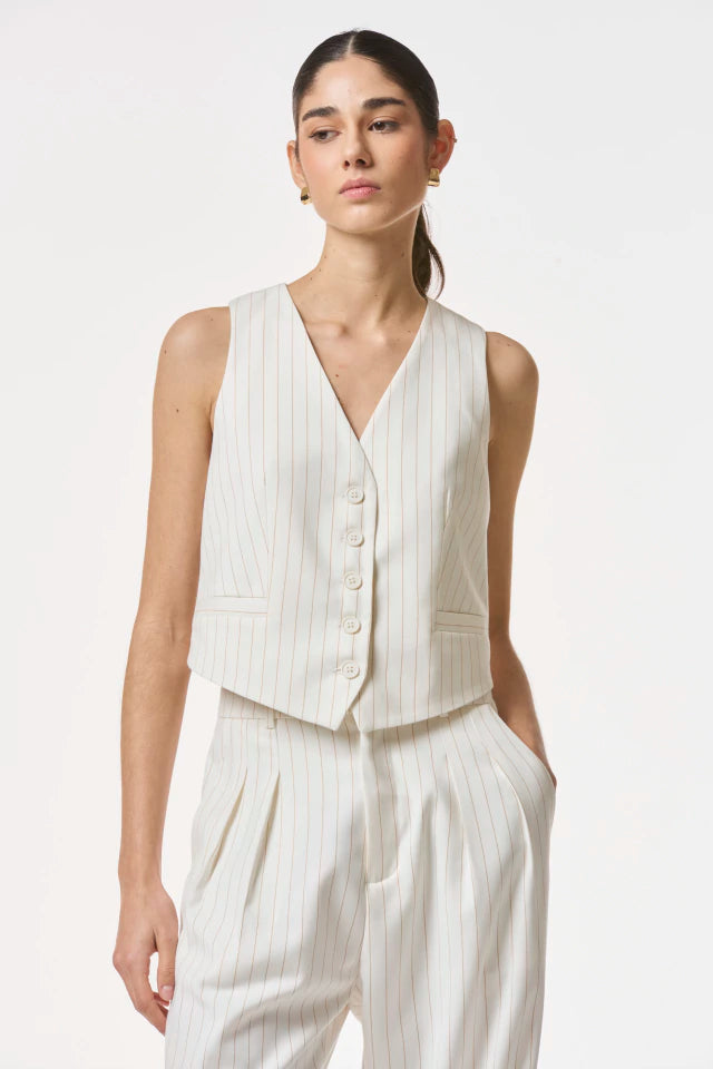 Chaleco sastre a rayas, de silueta recta con botones al frente y bolsillos de ojal. Interior forrado con tafeta jacquard. Disponible también en color Diplomatic black & silver.