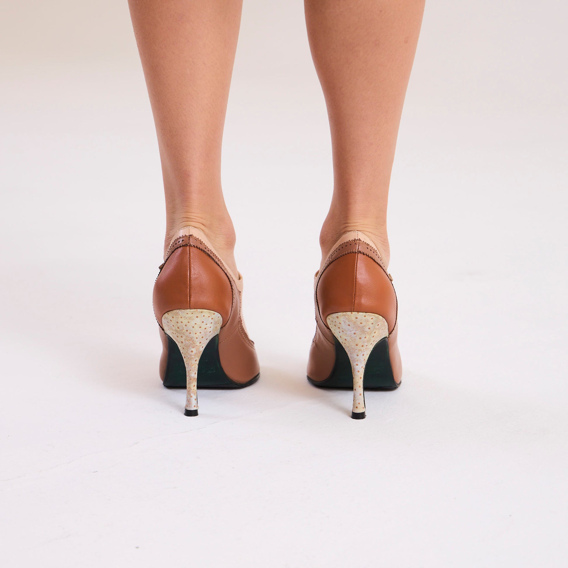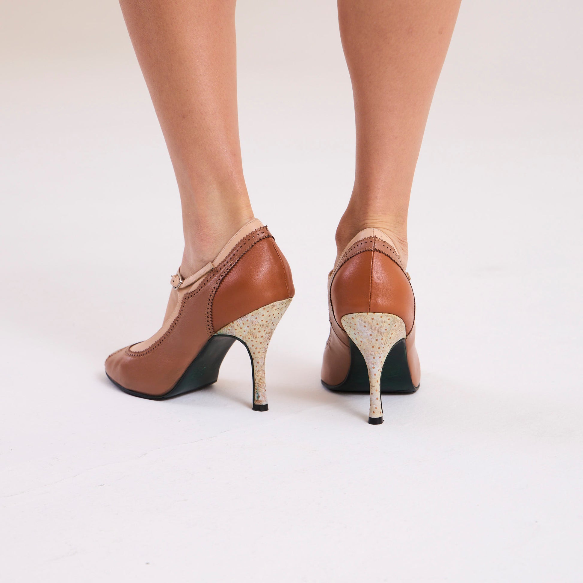 Hecho a mano con cuero vacuno combinado, forrado completamente en cuero natural y con suela también en cuero pintada, ofrece una sensación de suavidad y firmeza en cada paso. El taco de 8,5 cm estiliza la figura sin comprometer la estabilidad.
