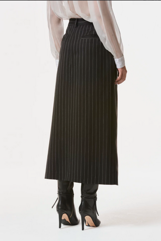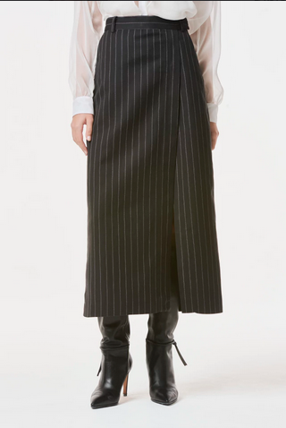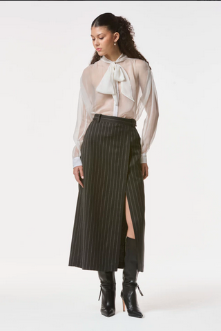 Falda sastrera confeccionada en Lino y algodón. Silueta tipo portafolio con acceso cruzado de botones sastreros a tono y broche pantalonero en cintura. Forrada totalmente de tafeta jacquard.