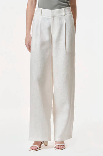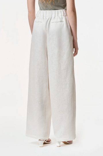 Pantalón sastrero confeccionado en 100% Lino. Silueta Wide Leg con cierre frontal y broches pantaloneros. Posee cintura alta de 5 cm con elástico en la cintura trasera. Bolsillos laterales reales y bolsillos ojal traseros.