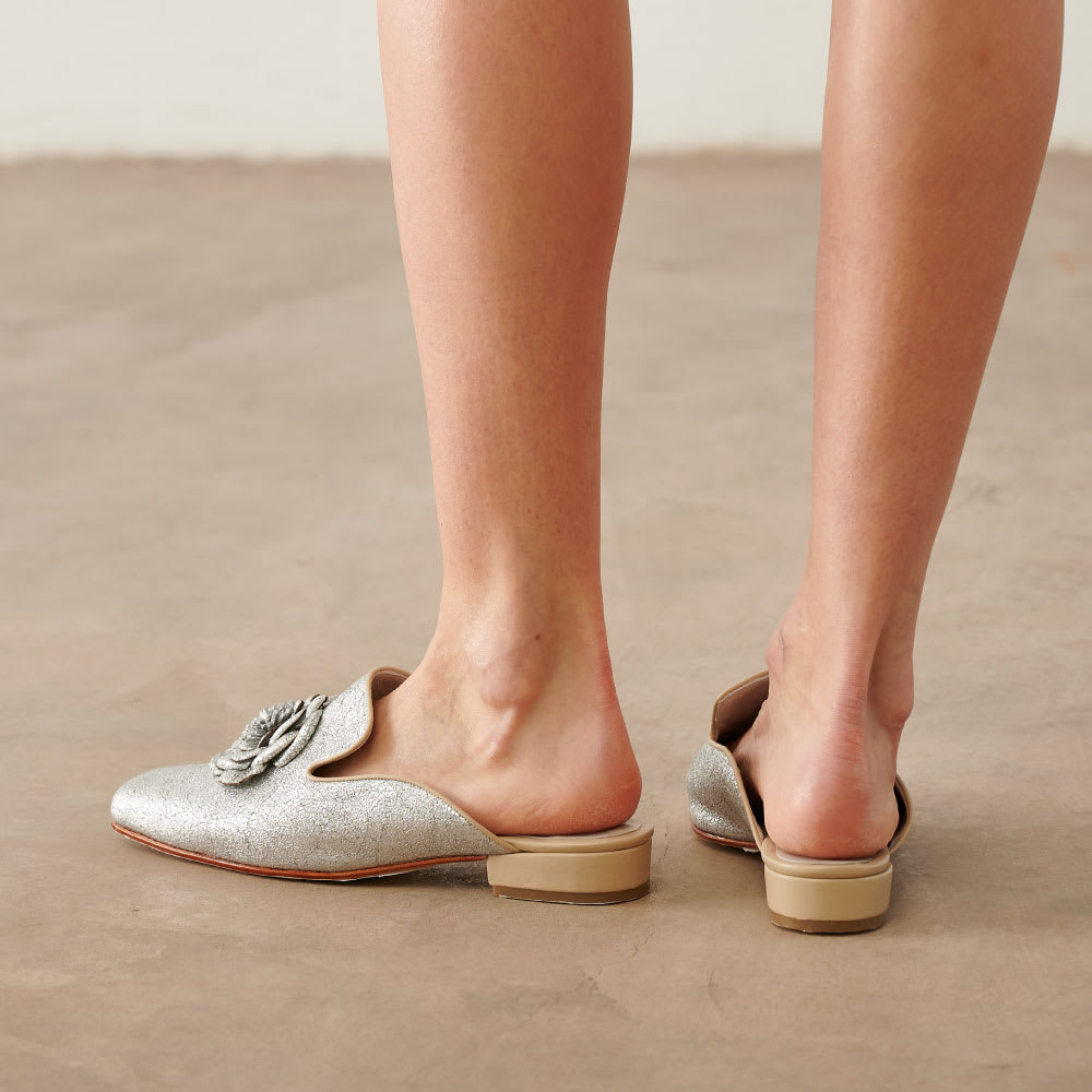 Material: Realizado en cuero fantasía plateado con cuero liso, forro de cabra y suela de cuero natural. Lleva un clip Magnolia. Altura del taco: 1,5 cm