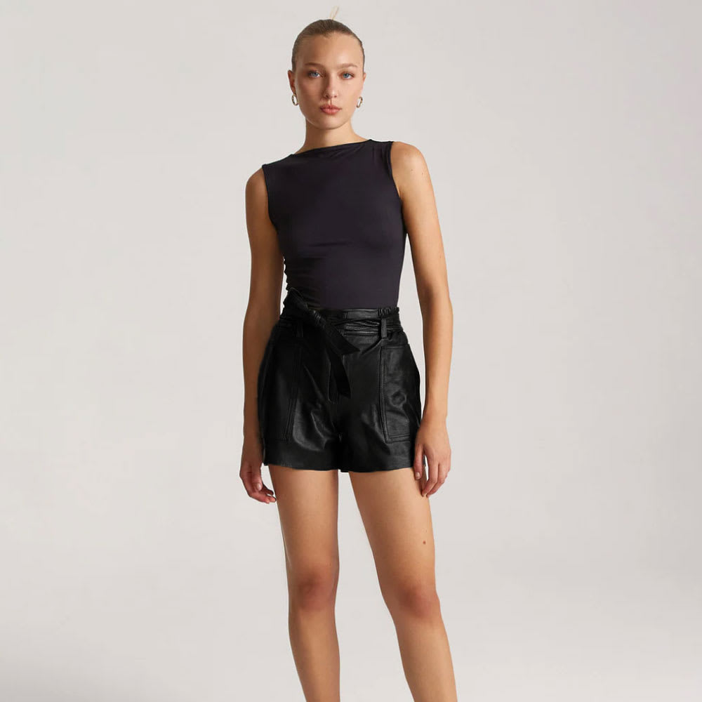 Short media pierna con boton y cierre frontal. Bolsillos de parche. Lazo ajustable en la cintura.