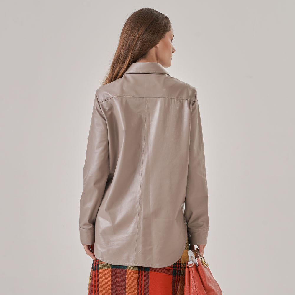 Confeccionada con cuero suave y flexible. Cuello camisero estándar, una abertura frontal de seis botones y puños con botones.