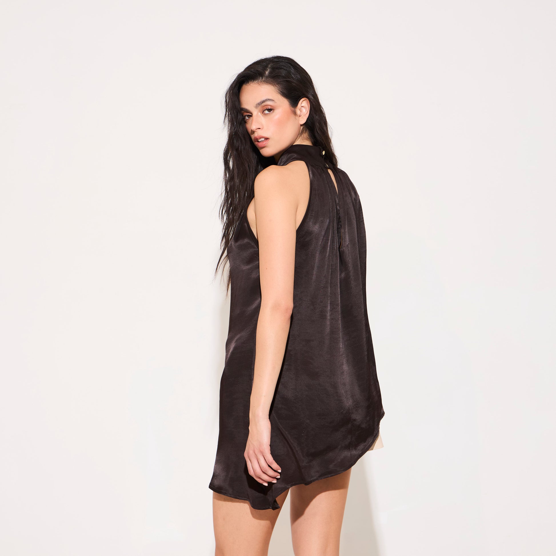 Top confeccionado en Satén. Silueta fluida con pliegue en el frente y terminación irregular por debajo de la cadera. Posee cuello y abertura de gota en la espalda con botones metálicos. Disponible también en color Cream.