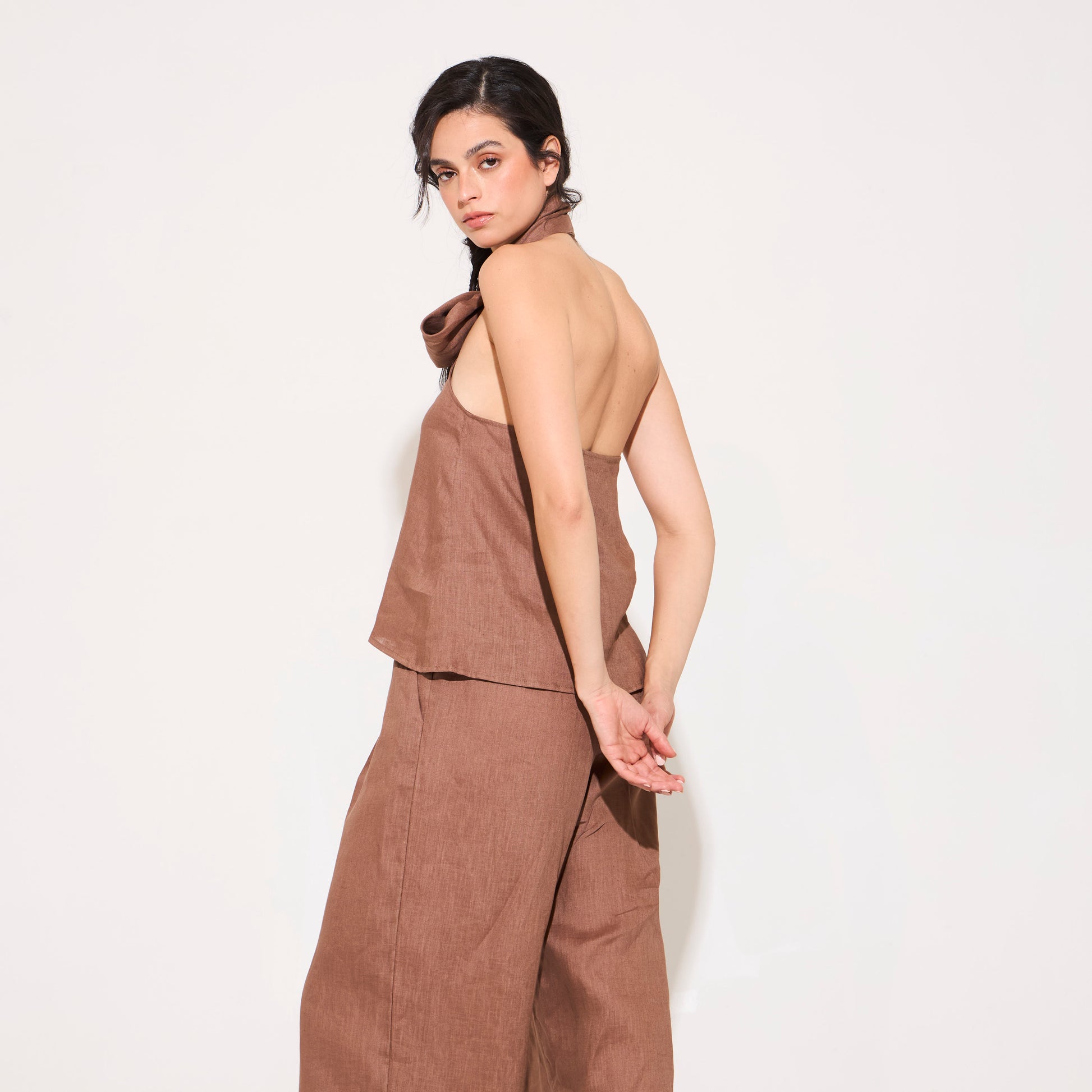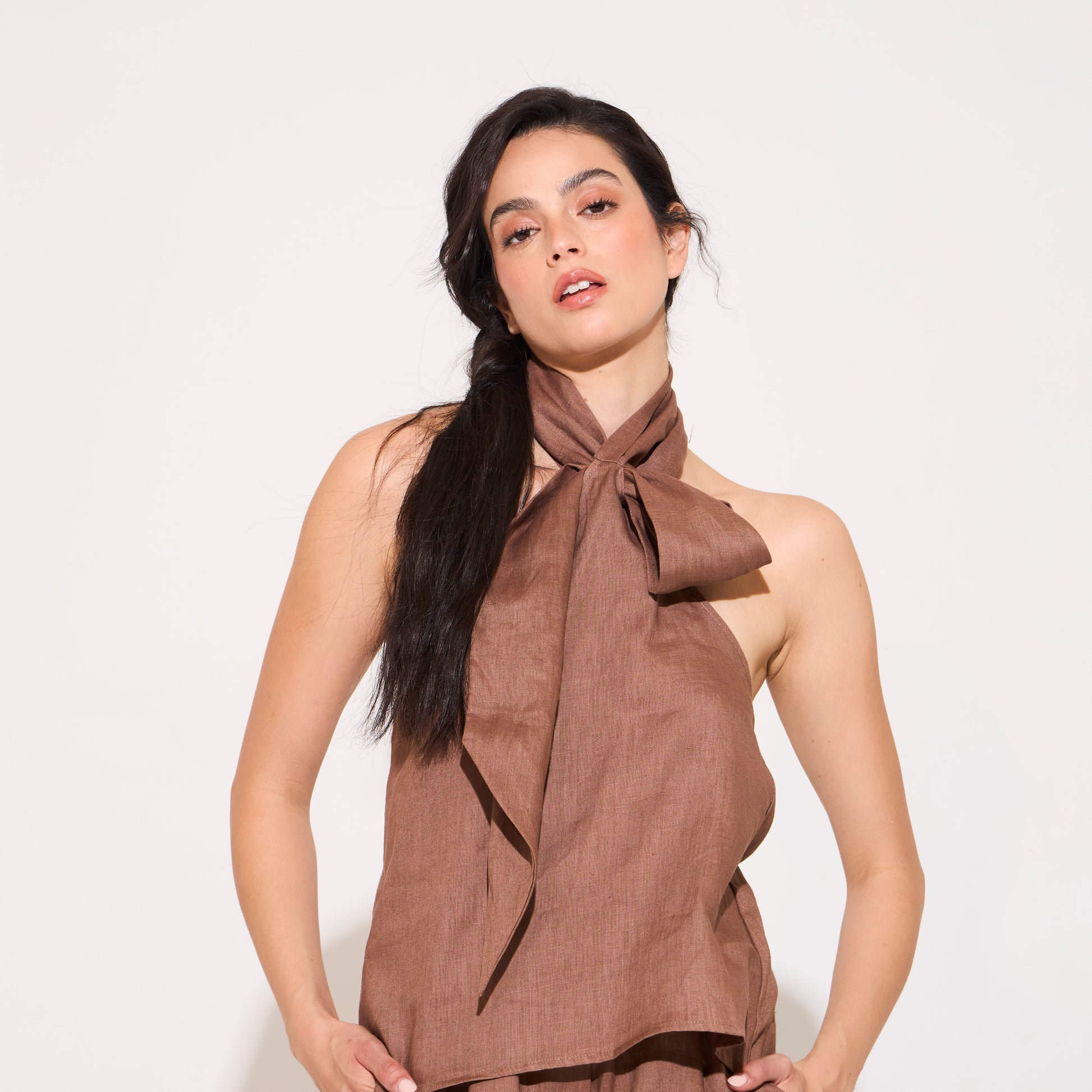 Top de lino con lazo. Silueta con terminación asimétrica y calce fluído hacia las caderas. Posee lazo con ojal en el cuello para regular. Disponible también en color Pistaccio, Off white & Stampa Fiori Yellow.