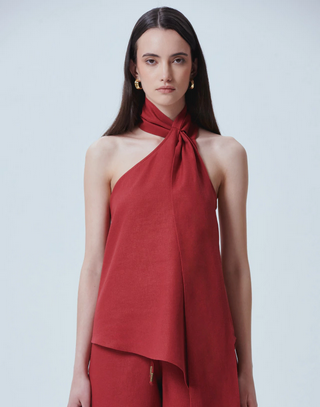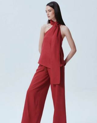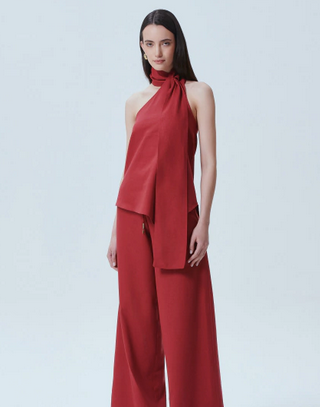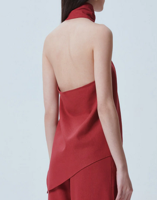 Top con lazo. Silueta con terminación asimétrica y calce fluído hacia las caderas. Posee lazo con ojal en el cuello para regular.