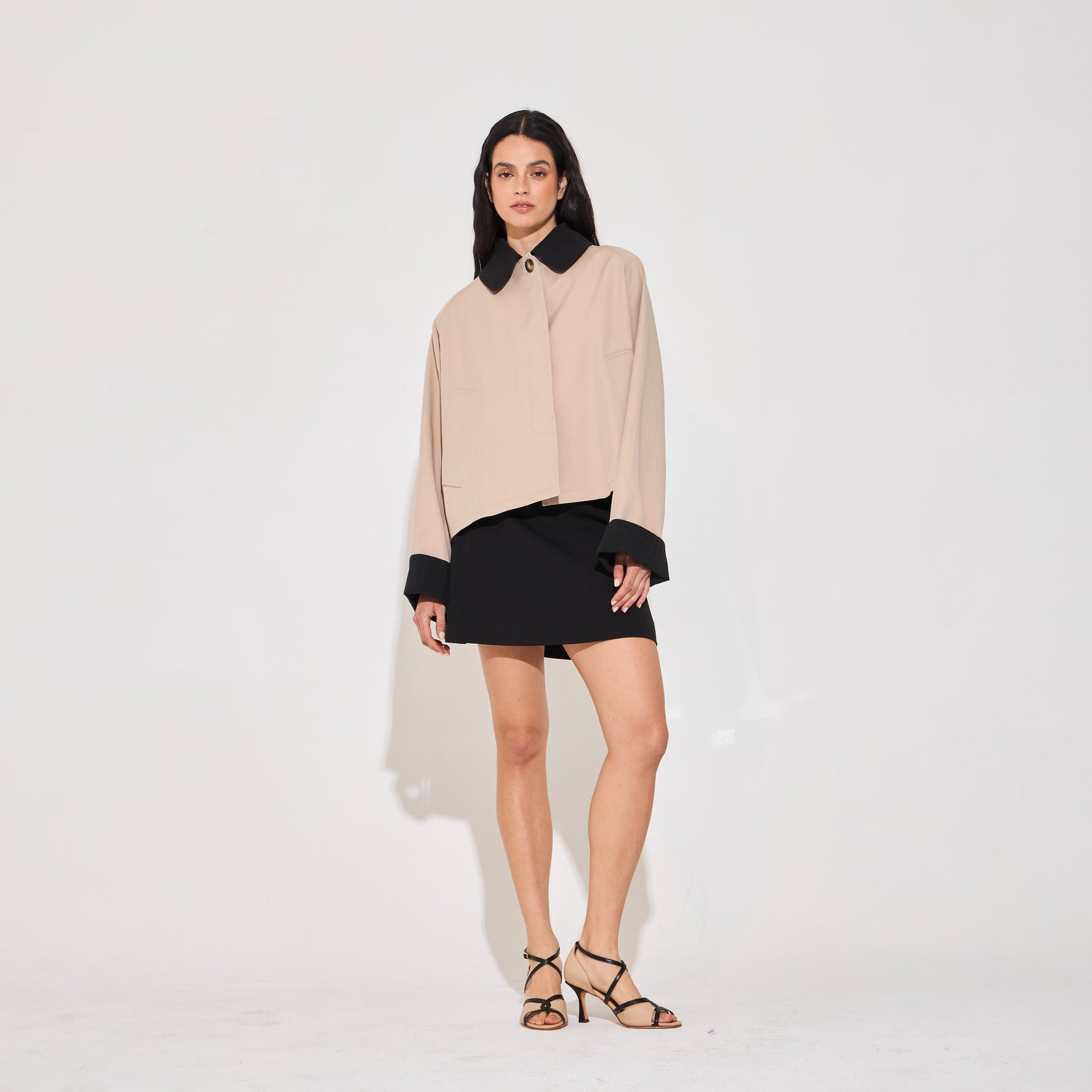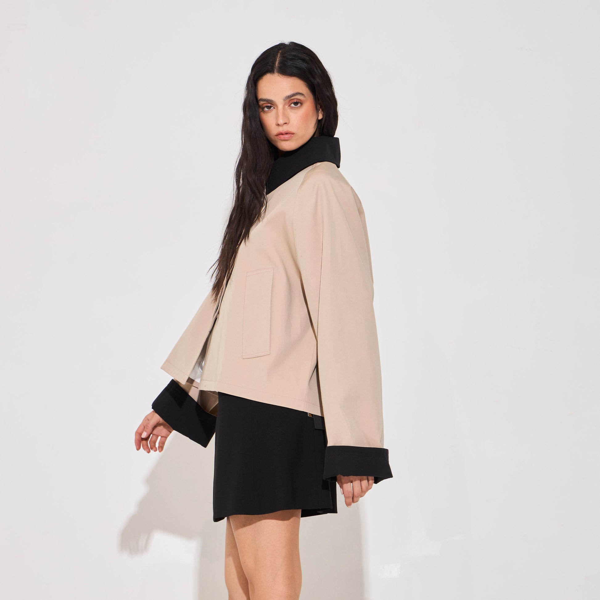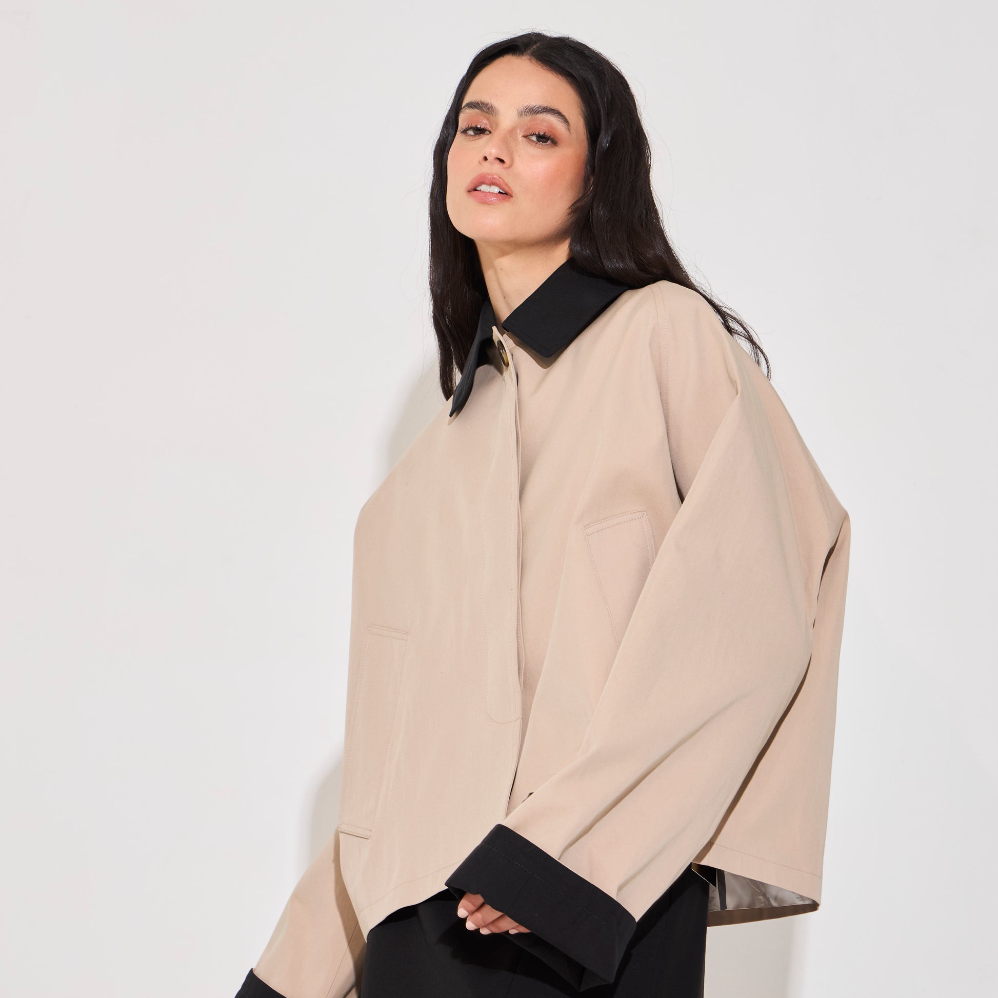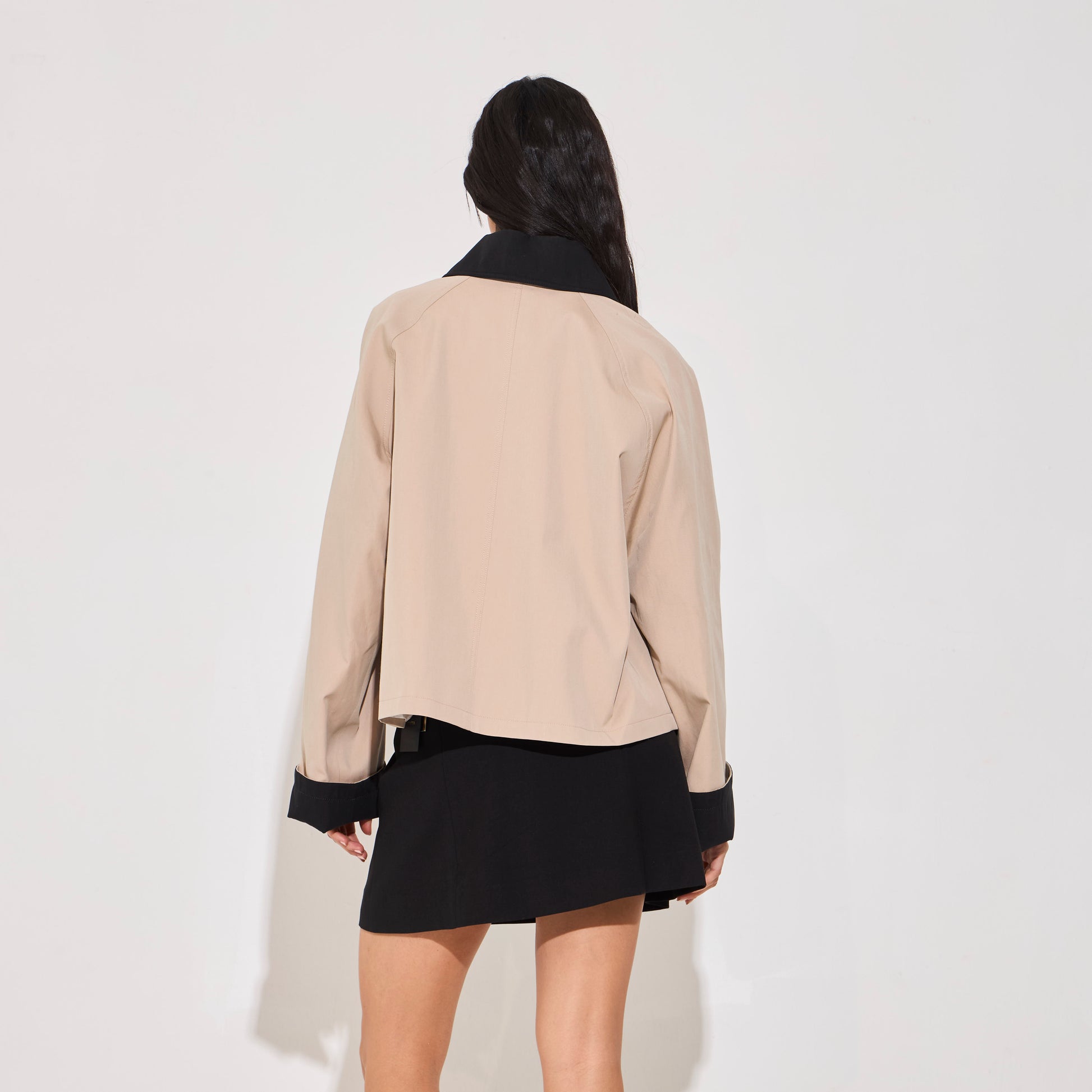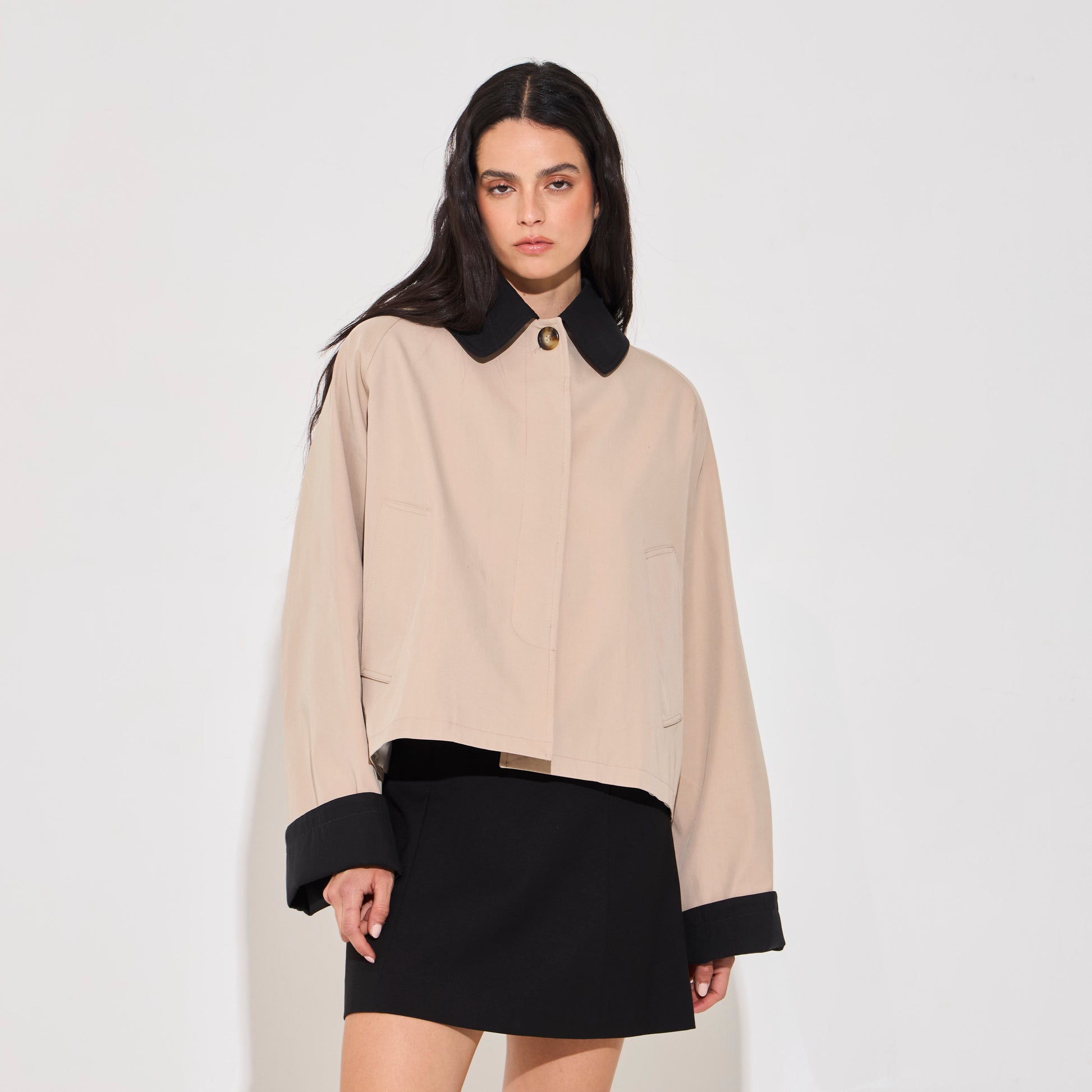 Trench corto impermeable. De silueta recta confeccionado en gabardina impermeable. Botones jaspeados al frente y bolsillos son solapa. Puños a contratono. Disponible también en color Navy.