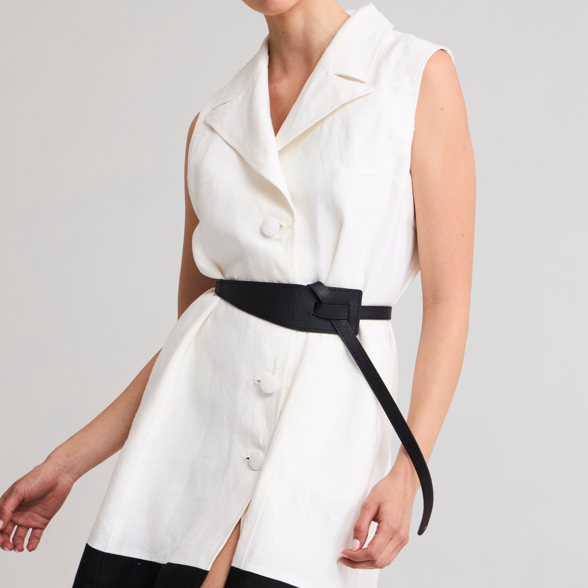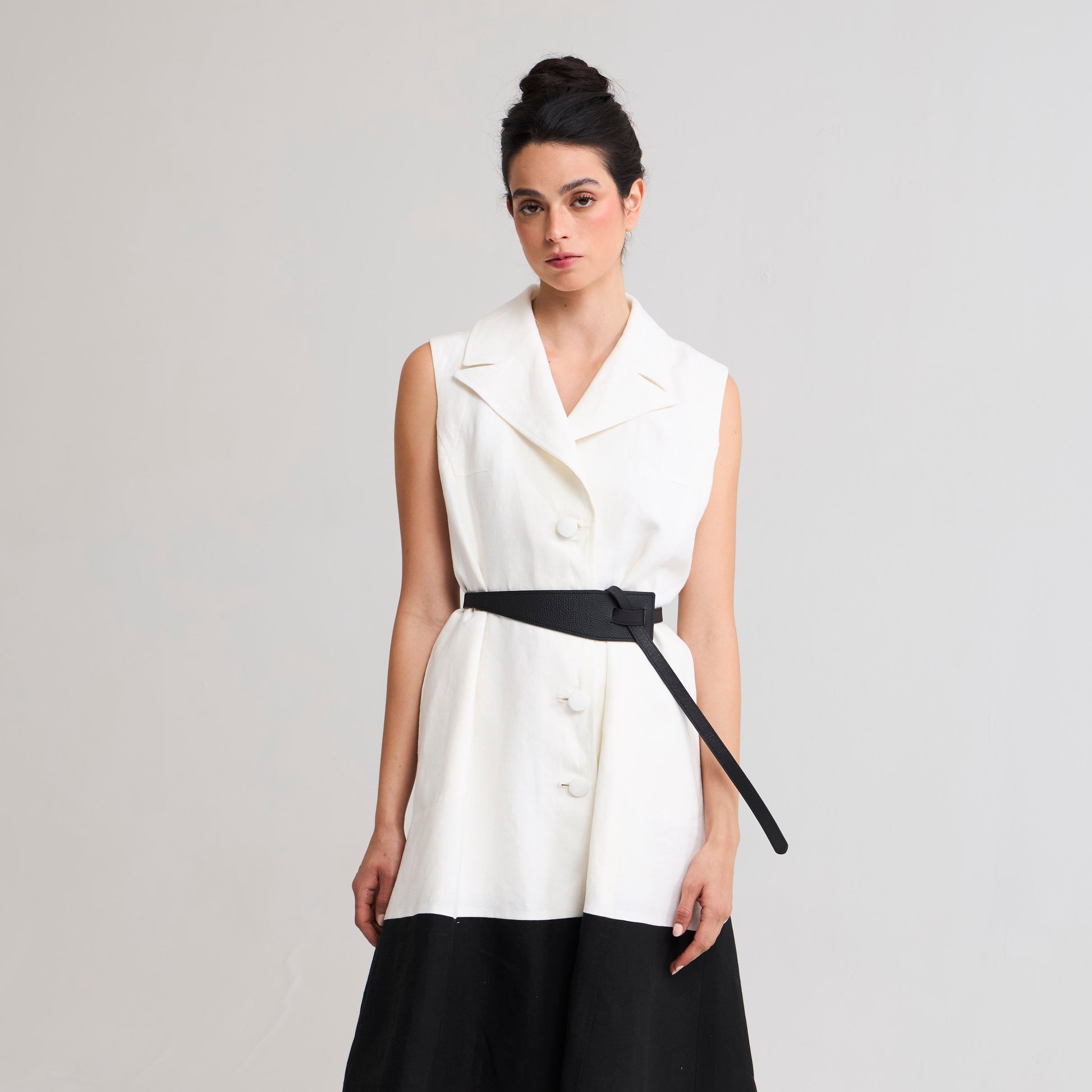 Diseño sastrería mujer. Una reinterpretación del gilet masculino, con solapa sastre y corte princesa. Lo puedes usar como vestido, como tapado sobre otras prendas o como jumper. La versatilidad de uso es un lema para La Margot. Tela: 100% lino 100% rayón fabricados en Chile